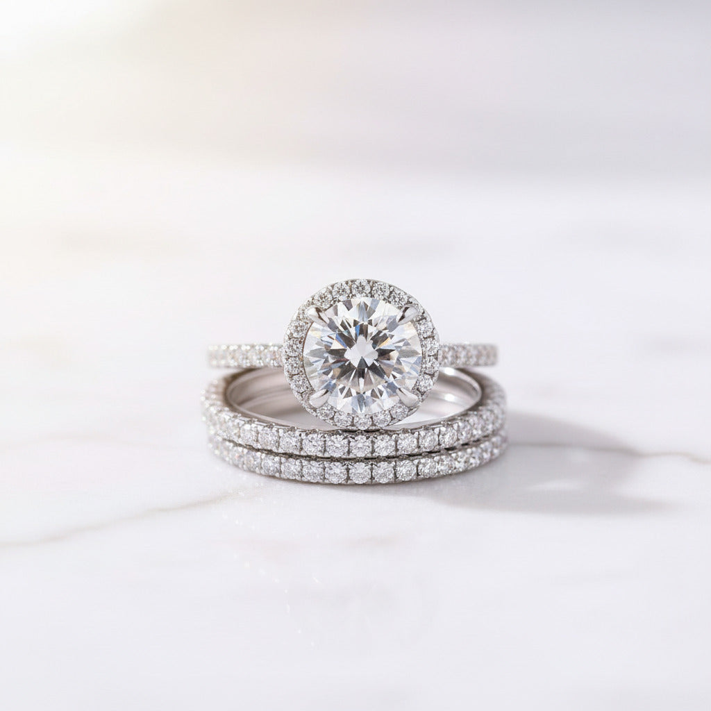 A three-piece wedding set with a round-cut diamond center stone surrounded by a halo of accent diamonds. Designed to work together as a complete bridal collection, these pieces offer timeless elegance for your special day.