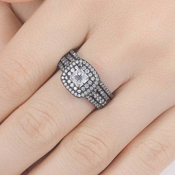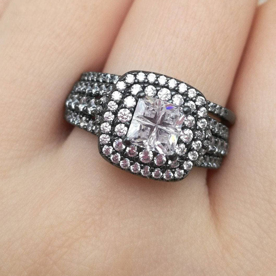 Double Halo Cushion Cut Diamond Black Engagement Ring Set