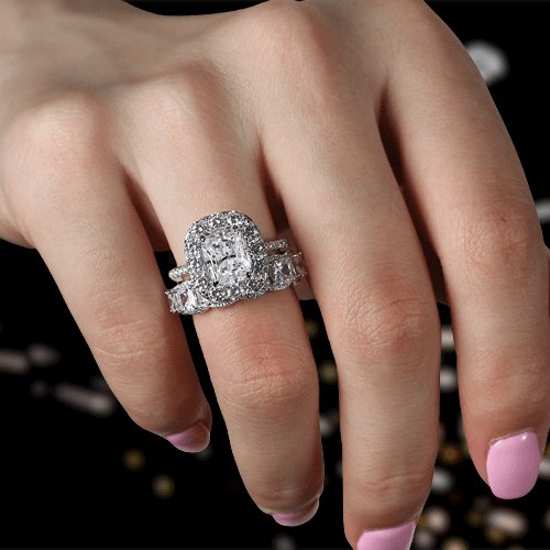 Discover the stunning Eternity Halo Cushion Cut Ring Set in White Gold, featuring a magnificent 2.5 carat certified moissanite center stone. The beautiful cushion-cut shape and clear color radiates pure elegance, while the surrounding round cut side stones add a touch of sparkle. Crafted with high quality 14K white gold, this ring set is truly a timeless treasure that will take your breath away.