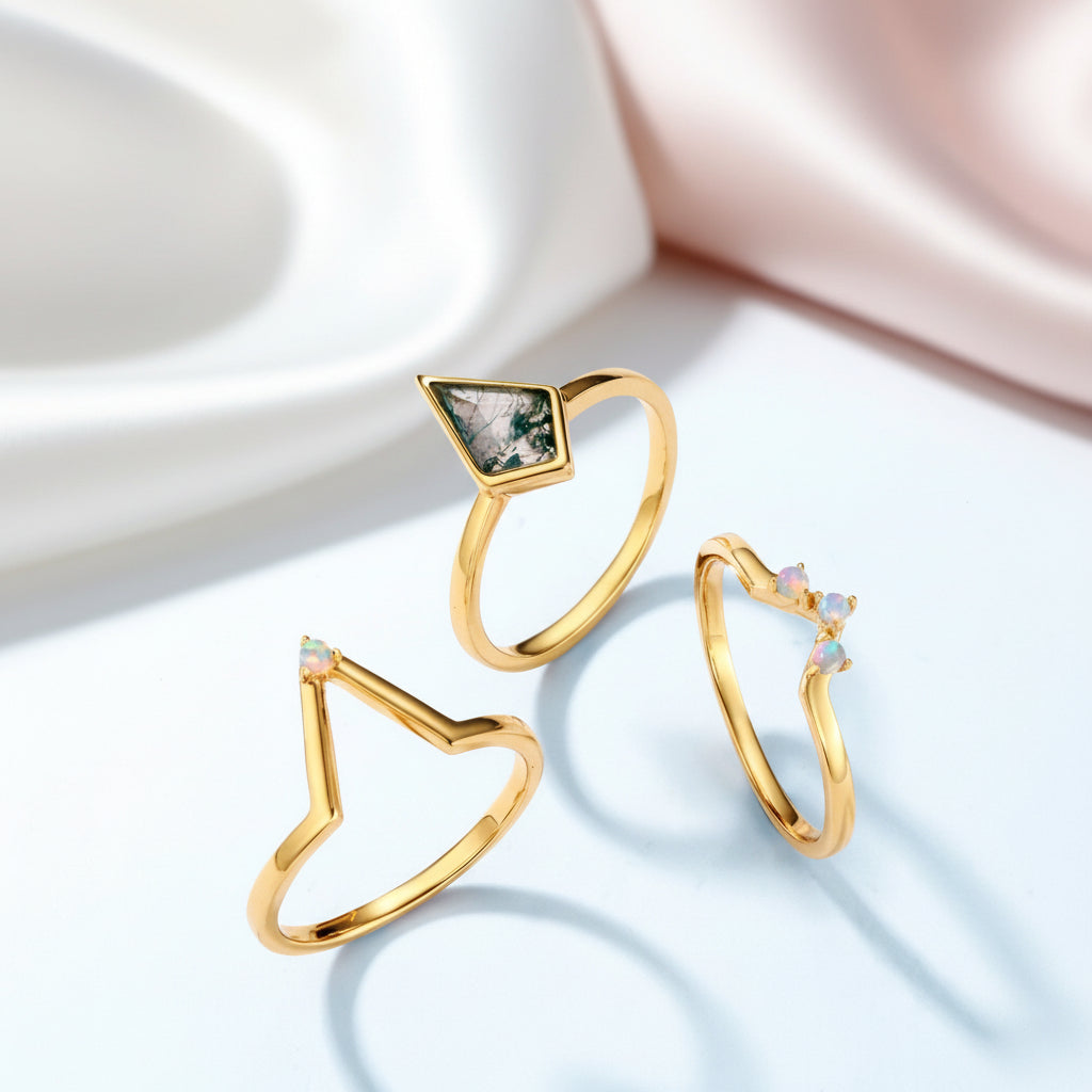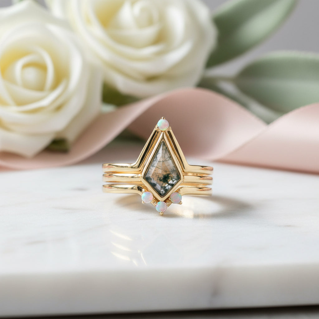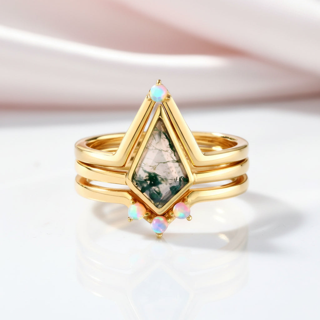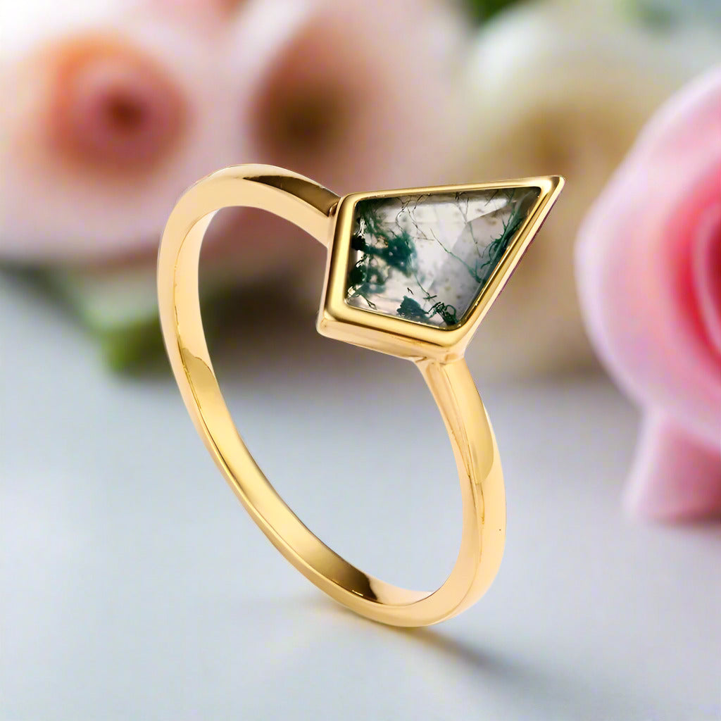 Adorn your hands in timeless elegance with this exquisite Natural Moss Agate Irregular Kit-cut Yellow Gold Wedding Ring. Expertly crafted from solid 925 Sterling Silver and fine 14k Yellow Gold plating, it features a Natural 6*10mm Moss Agate and lab opal stone in an enchantingly irregular kite-cut setting, delivering a captivating vintage style that is sure to draw admiring glances.