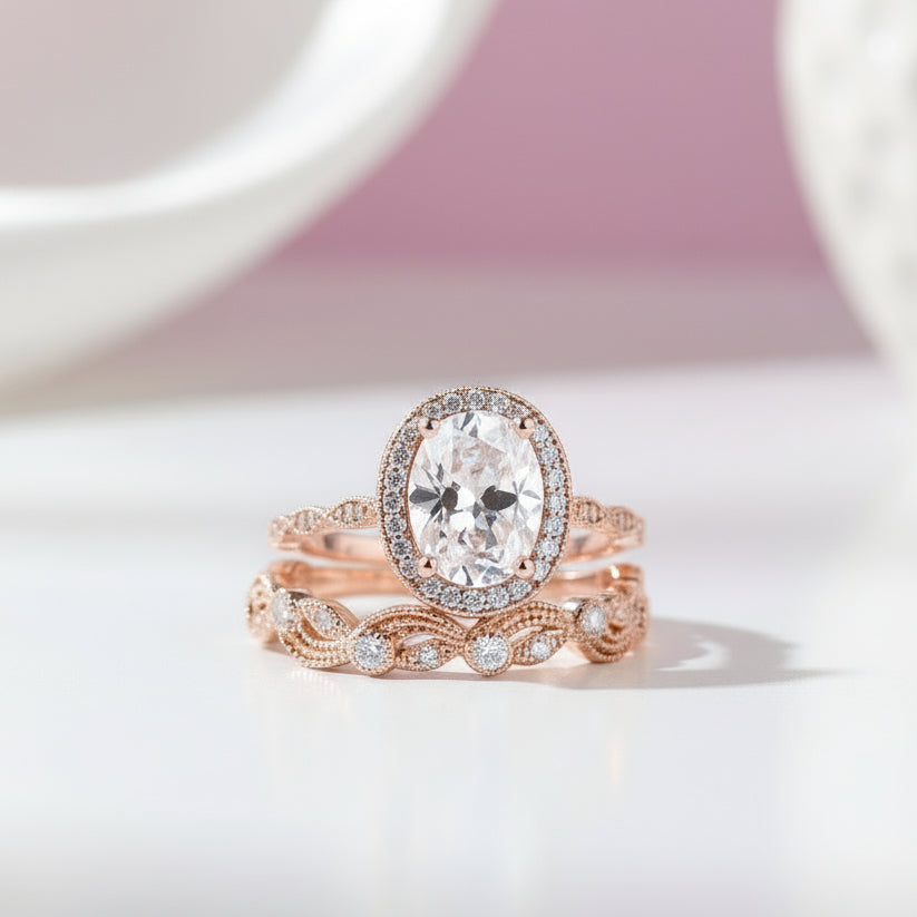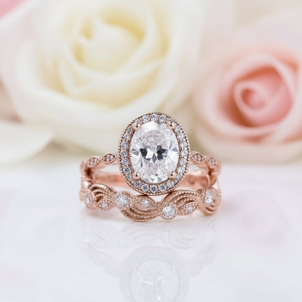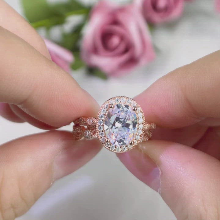 Oval Cut Clear Stone Halo Wedding Ring Set in Rose Gold