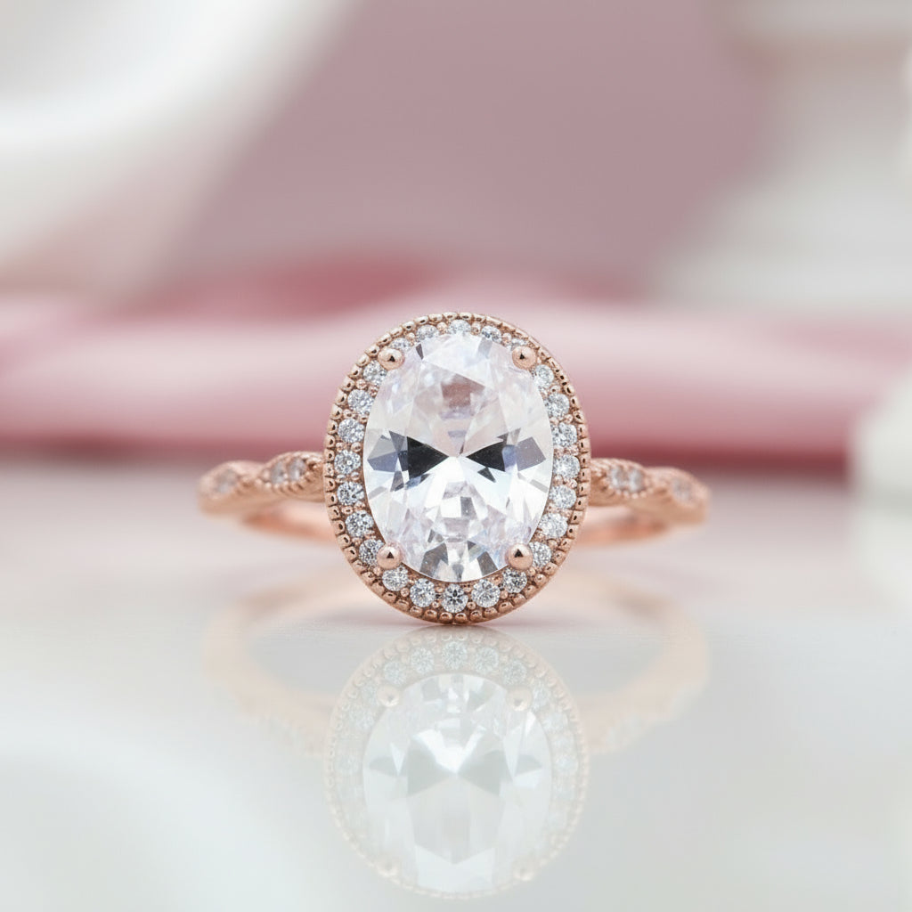 Elegant oval cut halo ring in rose gold featuring a hand-cut simulated diamond that sparkles like the real thing at a fraction of the price. Precision-polished for maximum brilliance and built to last with daily wear. Perfect for engagements, weddings, or any special occasion. Includes one-year warranty and 30-day guarantee.