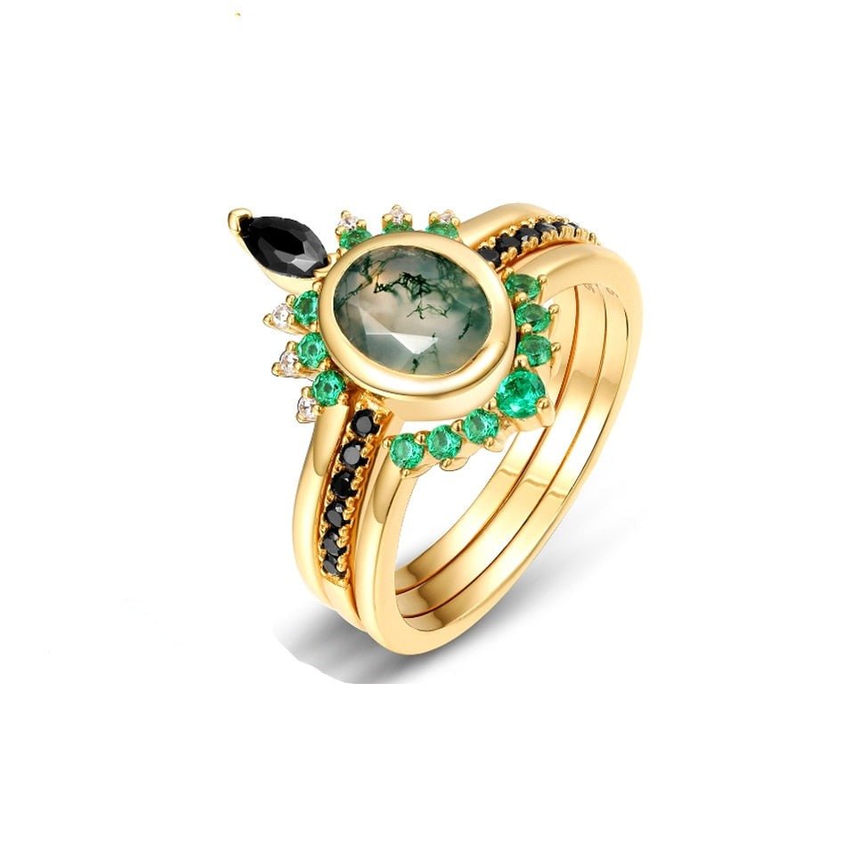 Oval cut Natural Moss Agate Yellow Gold Wedding Ring Set