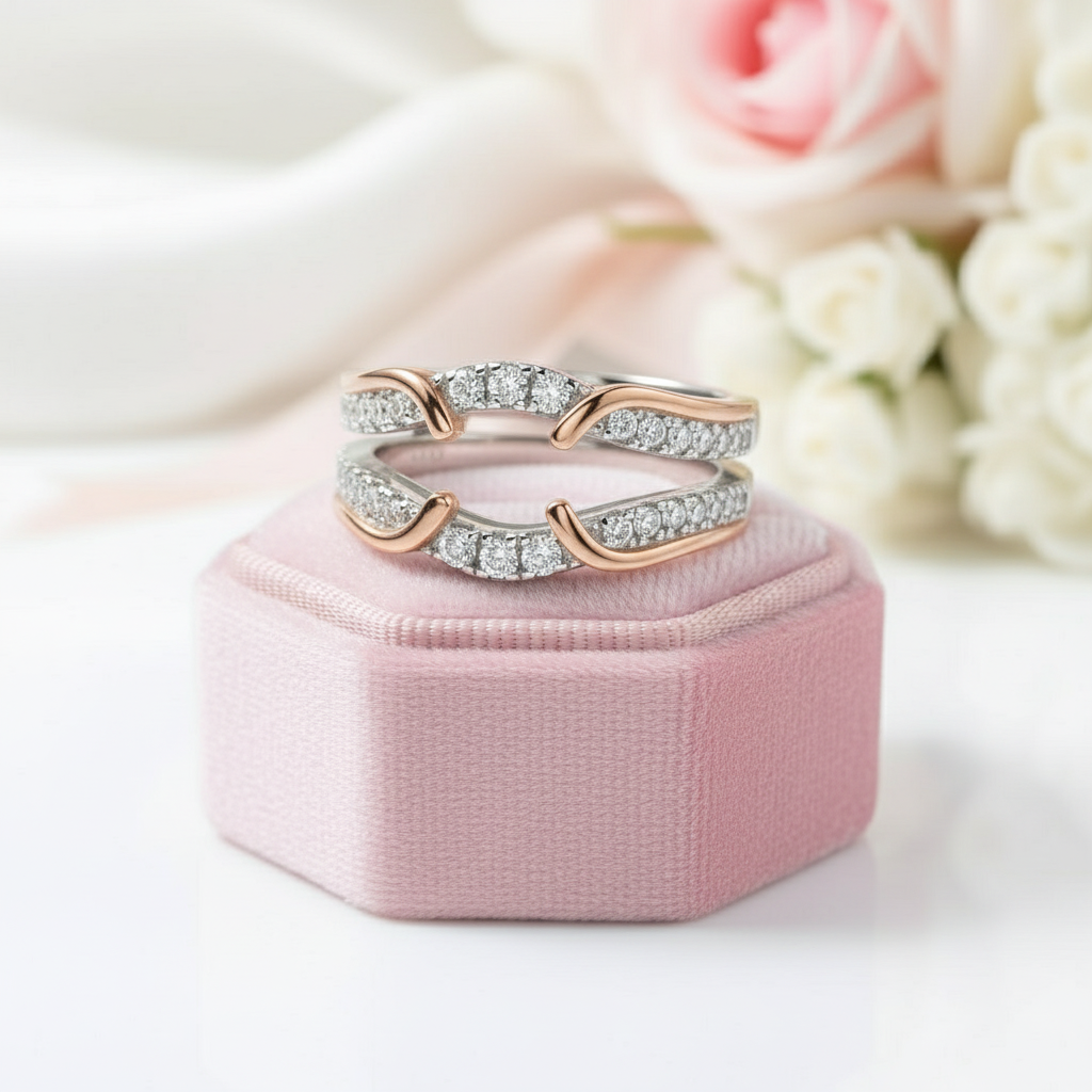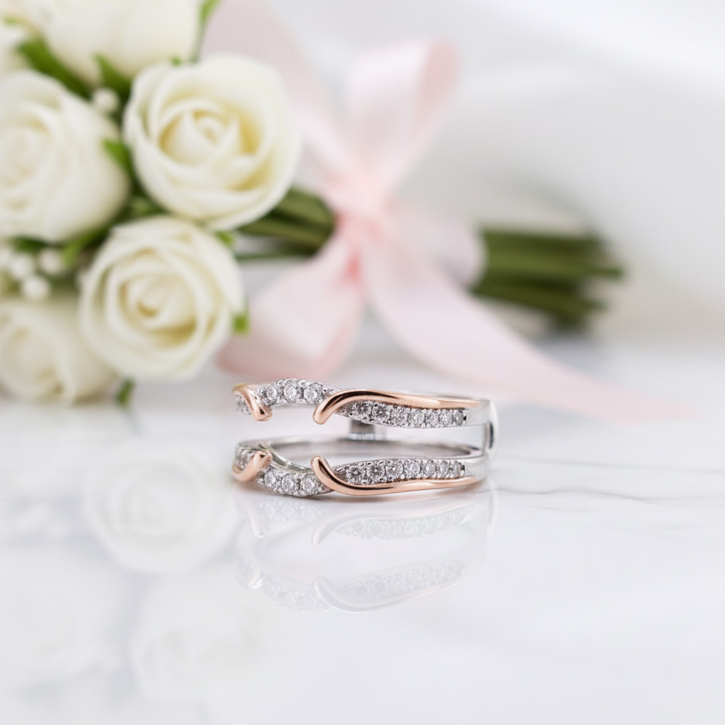 Enhance the beauty of your round-cut diamond ring with the exquisite Diamond Alternative Rose Gold Accent Ring Enhancer. Crafted with a silver band and adorned with mesmerizing rose gold accents, this ring enhancer effortlessly elevates the elegance of your existing ring. Designed to perfectly fit and complement any round-cut diamond, it adds an extra flair and sparkle to your beloved piece. With its lightweight design and stunning craftsmanship, this enhancer is both comfortable to wear and visually captivating. Upgrade your style with this enchanting piece and indulge in the allure of Diamond Alternative .