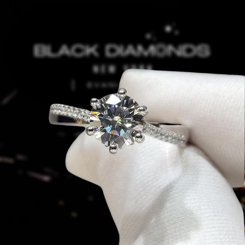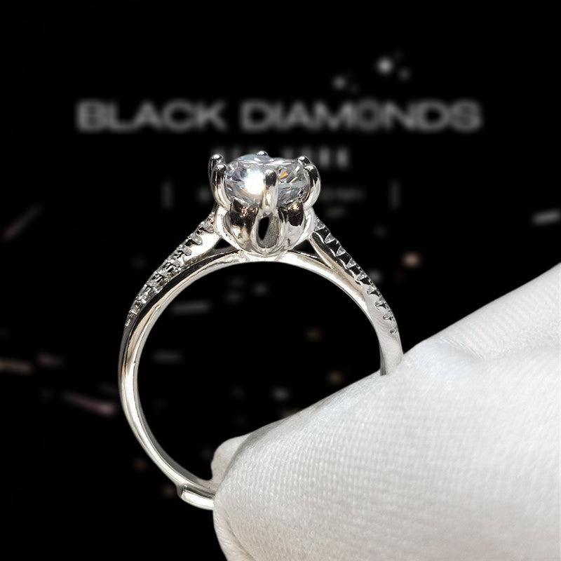 Make her dreams come true with our exquisite 1.0 Ct Round Cut D Color Certified Moissanite Engagement Ring by Black Diamonds New York. The 6.5mm moissanite stone shines with unparalleled beauty, set in a setting of high quality 925 silver dipped multiple times in Platinum. This sparkly and affordable ring is the perfect choice to symbolize your love.