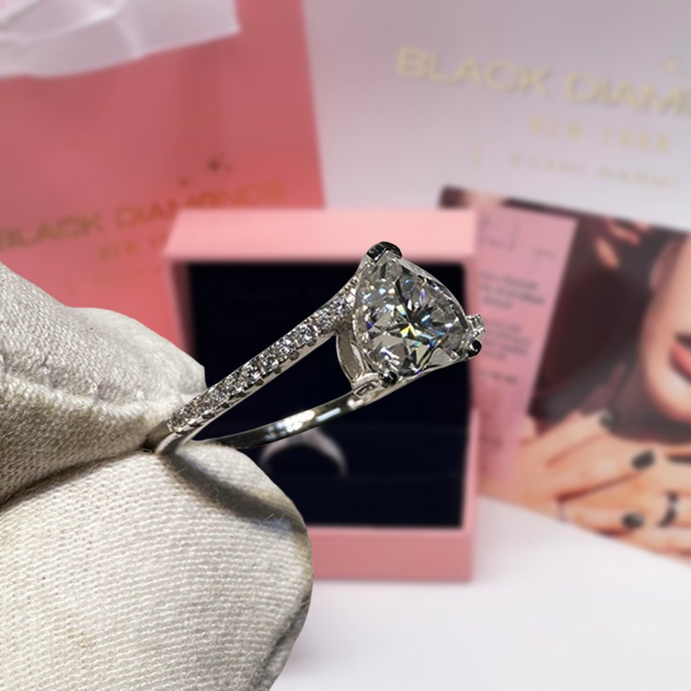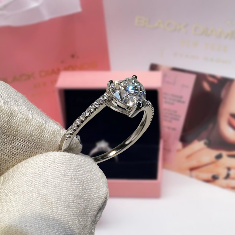 Fall in love all over again with this exquisite 1 carat heart cut moissanite diamond engagement ring by Black Diamonds New York. Boasting a stunning moissanite stone set in 925 silver dipped 5x in 18k white gold, this ring is a symbol of beauty and grace. The enthralling sparkle of the stone will leave you and all who see it mesmerized.