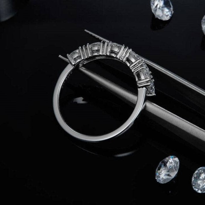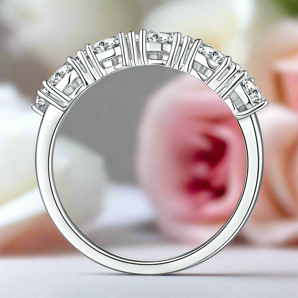 Fall in love with our stunning 1.0 Ct Heart Cut Certified Moissanite Wedding Band from Black Diamonds New York. With its gorgeous design featuring heart cut moissanite stones in a half eternity setting, this ring is a perfect symbol of your love. Crafted with high quality 925 silver dipped 5x in 18k white gold, it's a luxurious yet affordable choice for your special day.
