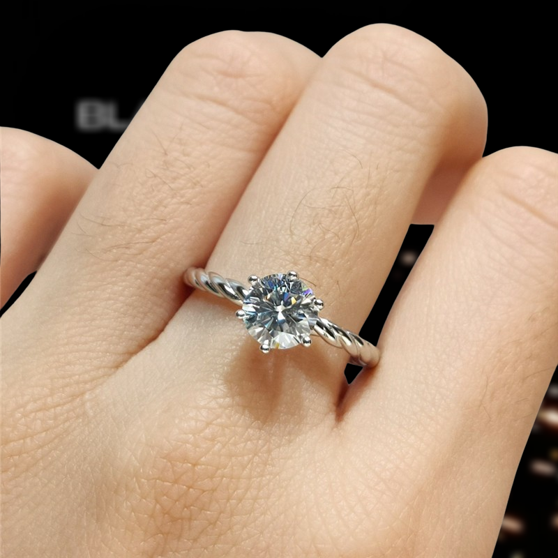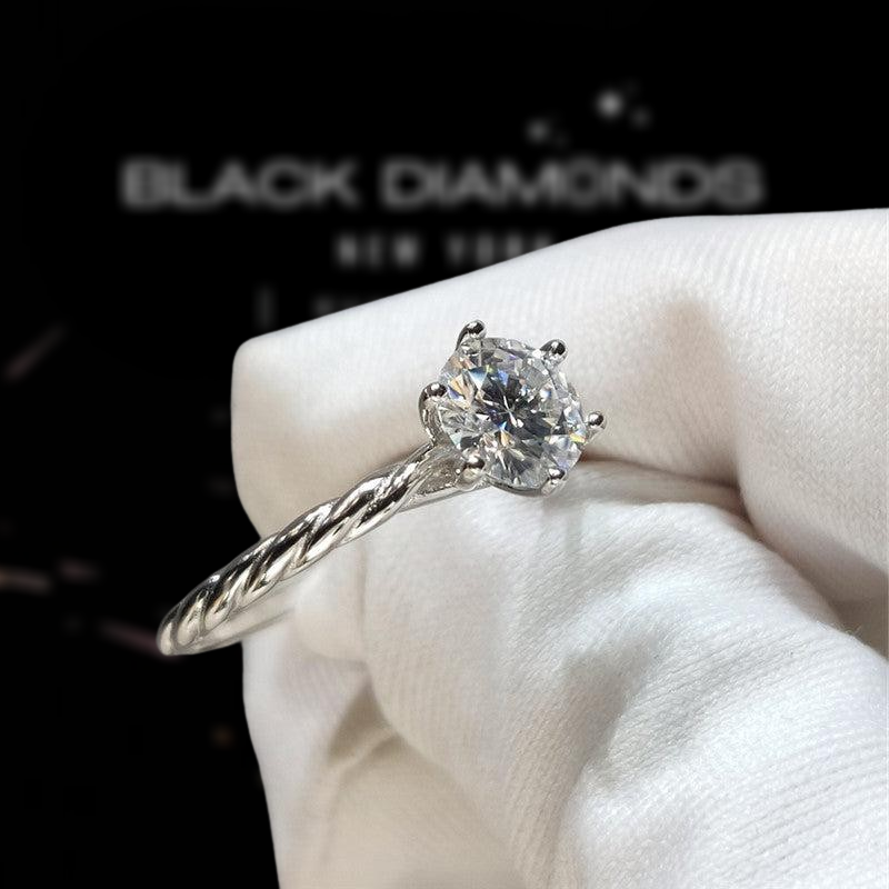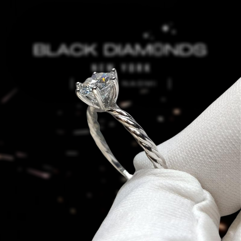 Unleash your inner sparkle with the 1.0 Ct Round Cut Diamond Creative Rope Shape Engagement Ring from Black Diamonds New York. This show-stopping ring features a dazzling round cut D color moissanite stone set in a twist band design for a modern and elegant look. Crafted with high quality 925 silver dipped 5x in 18k white gold, this ring is both affordable and radiant, making it the perfect choice for your special occasion.