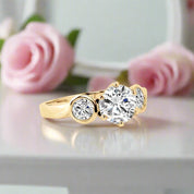 Elevate your love story with the exquisite 10k Yellow Gold Three Stone Round Certified Moissanite Engagement Ring from Black Diamonds New York. Crafted with precision and care, this stunning piece features three round-cut moissanite stones that sparkle with unrivaled beauty and elegance. Each stone is set in a high-quality setting, creating a mesmerizing display of brilliance that is sure to captivate all who behold it. Indulge in luxury without breaking the bank - this affordable yet luxurious ring is the perfect symbol of your everlasting love.