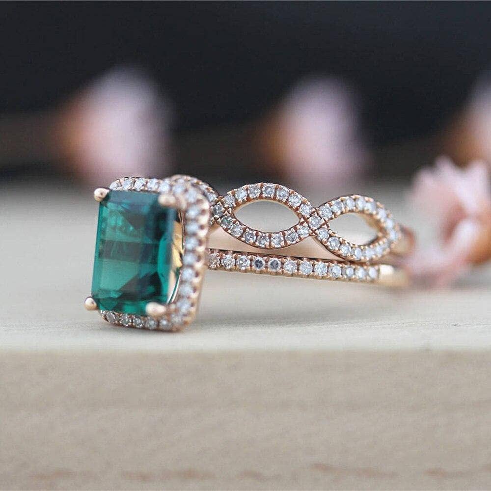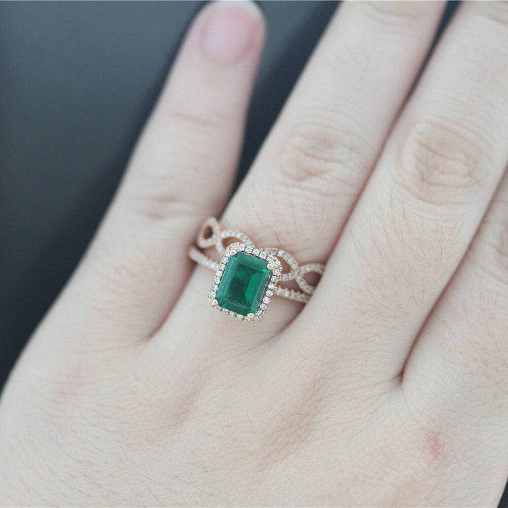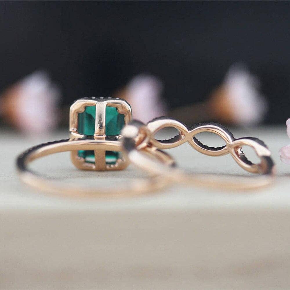 14K Gold Emerald Cut Green Diamond Wedding Ring Set