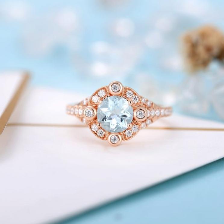 14k Rose Gold Aquamarine Milgrain Halo Engagement