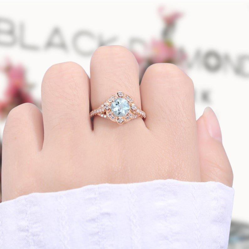 Exude timeless elegance and luxurious sophistication with our stunning 14k Rose Gold Aquamarine Milgrain Halo Engagement Ring. Crafted with premium quality and expertly cut Aquamarine gemstone set in a classic halo setting, this gorgeous piece is sure to captivate admirers. Beautifully crafted with milgrain detailing, this dazzling ring showcases the unparalleled craftsmanship of Black Diamonds New York. Elegant and glamorous, this gorgeous engagement ring is the epitome of sophisticated style at an affordable price. Embrace modern sophistication with this beautiful ring.