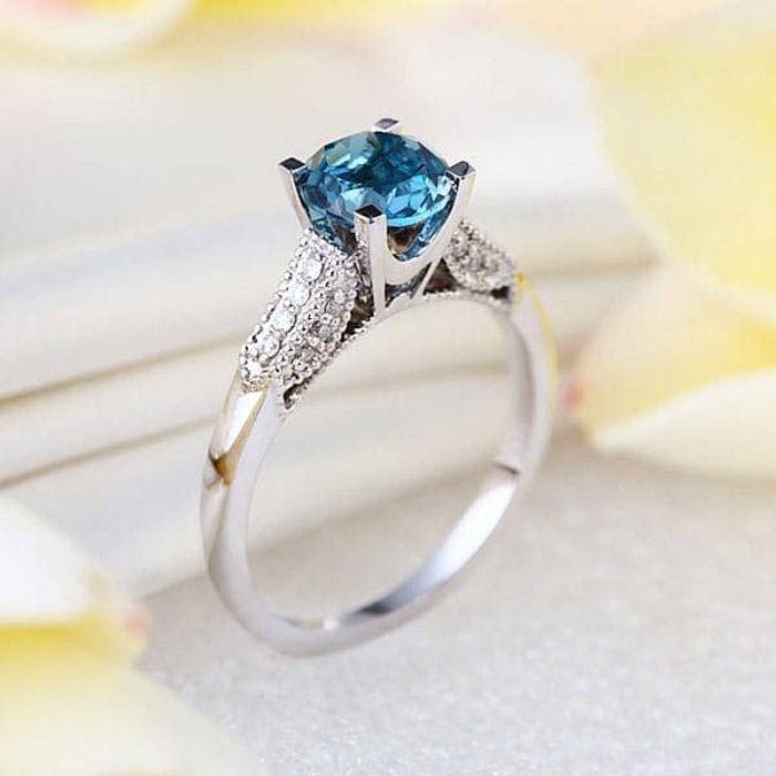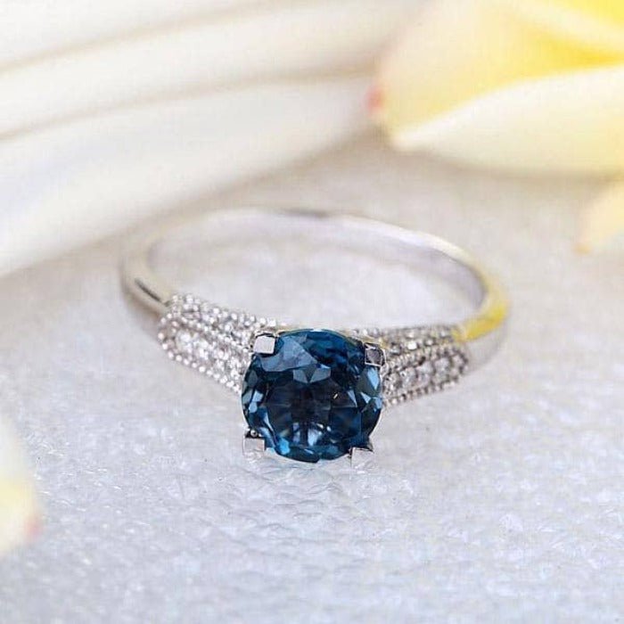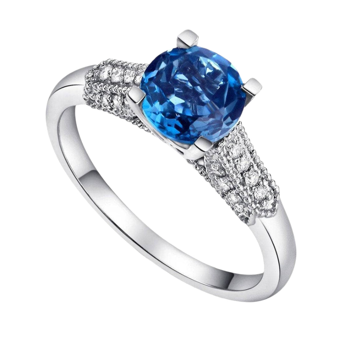 Luxury takes on a new form with this exquisite 14k White Gold 1.2 Ct London Blue Topaz & Natural Diamond Ring. Its eye-catching 1.2ct round cut blue topaz center stone is wonderfully complemented by beautiful side stones of round cut diamond with a stunning sparkle. Exquisite craftsmanship and high quality materials make it an affordable and timeless piece for the modern fashionista.