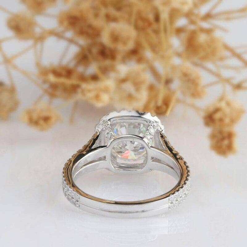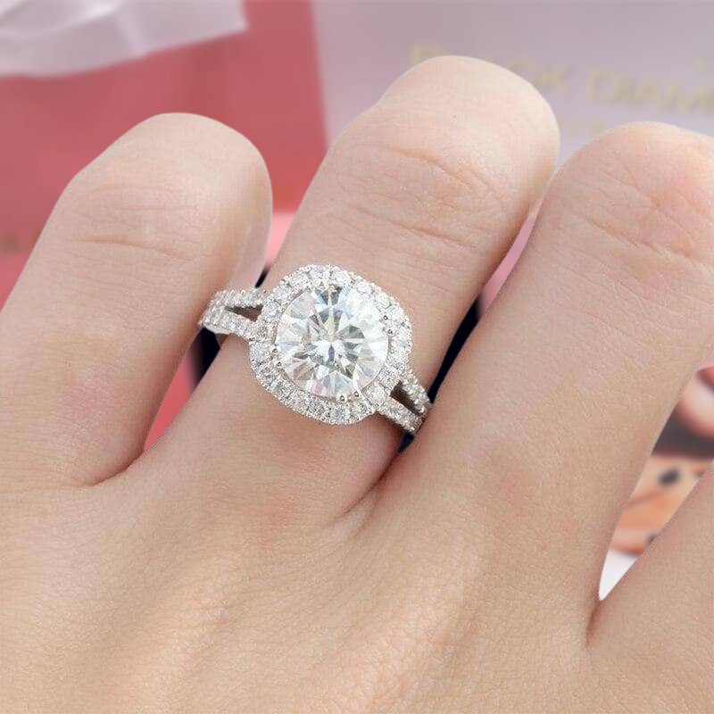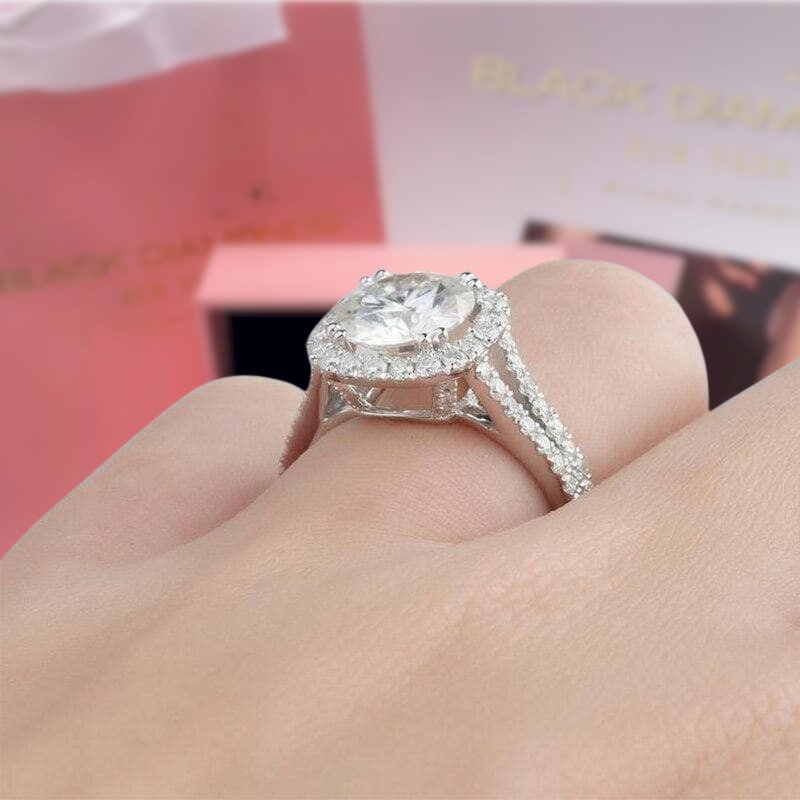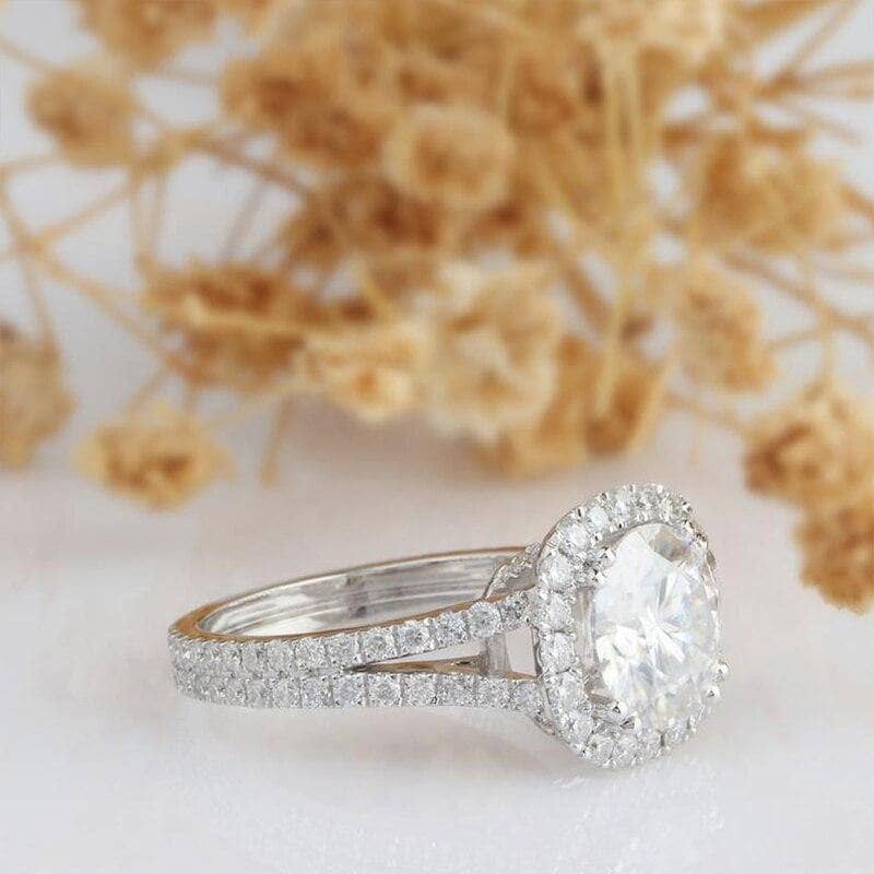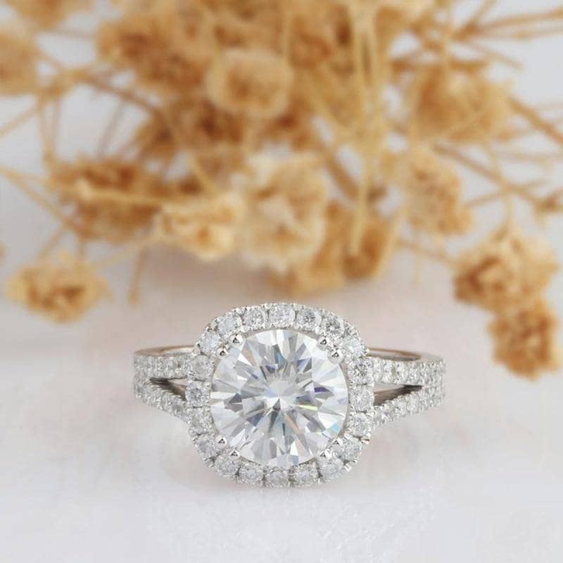 Boasting craftsmanship of the highest caliber, this 14k white gold 3ct 9mm Certified Moissanite halo engagement ring is designed to present a striking, dazzling statement. Featuring a round cut stone with VVS color quality, the ring's beauty is further enhanced by a glistening halo with a split band that reflects quality. Offering luxurious yet budget-friendly wedding jewelry, this ring is sure to draw admiration.