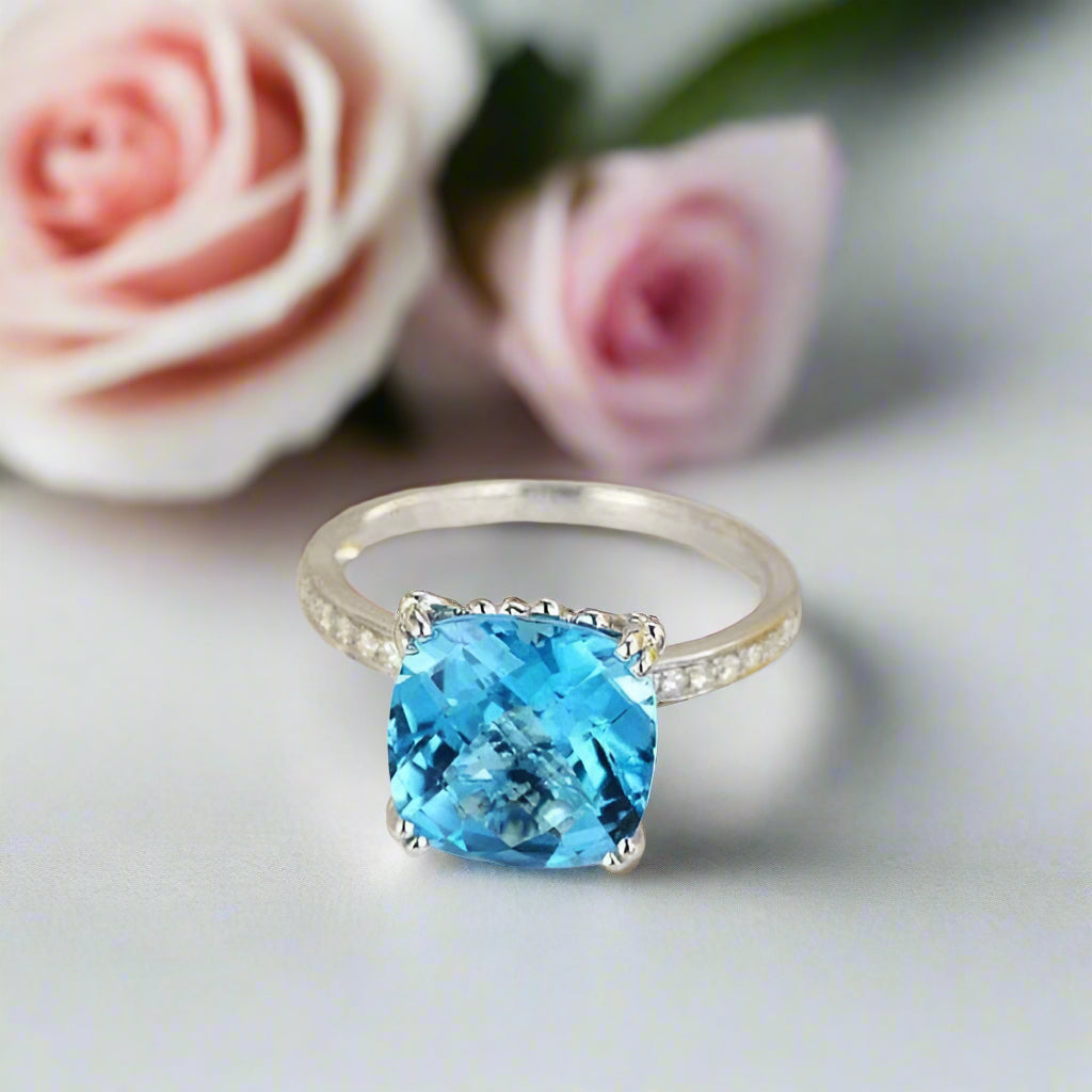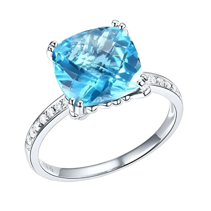 Elevate your loved one's jewelry collection with this stunning 14k white gold 4.5ct cushion cut Swiss Blue Topaz Natural Diamond ring. Its high-caliber craftsmanship ensures a luxurious and sophisticated look, while the gorgeous band stones and sparkling details add a dose of glamour. An affordable and eye-catching piece – perfect for any special occasion.