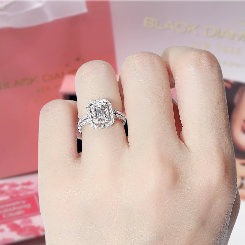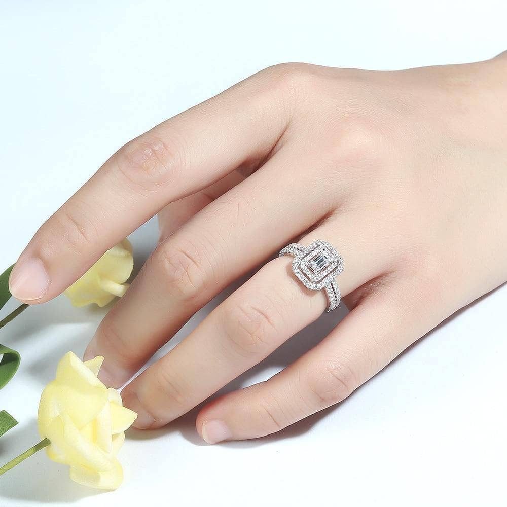 Boasting a 14k white gold construction and a dazzling emerald cut diamond set with a double halo of shimmering stones, this engagement ring is an exquisite choice. Its eye-catching design and quality craftsmanship is sure to delight, while its affordability ensures that it won't exceed your budget. Experience the joy it will bring today!