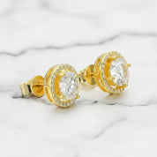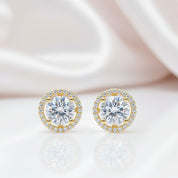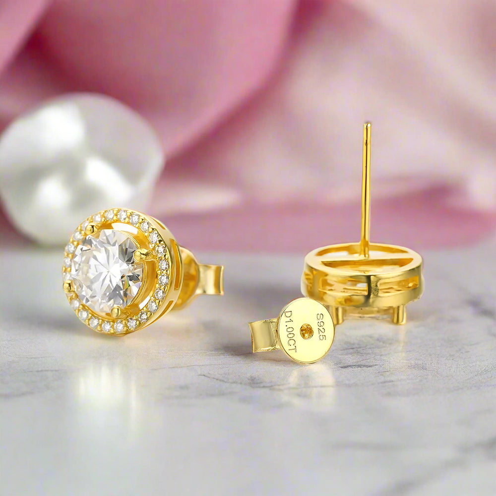 Black Diamonds New York's 2.0 Ct Round Cut Moissanite Stud Earrings feature sparkling 2-carat stones with VVS1 clarity. Made from 925 silver and coated five times in 18k gold, these earrings offer elegant shine and lasting quality for any occasion.