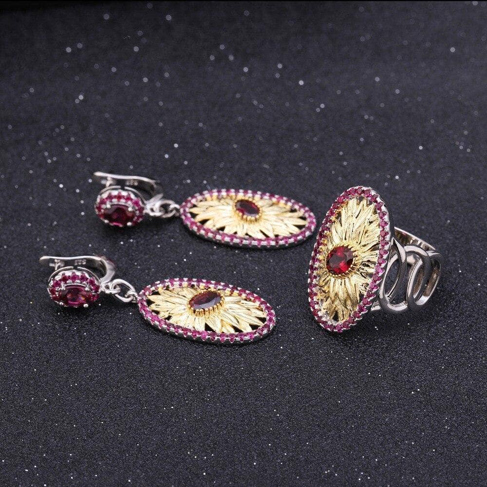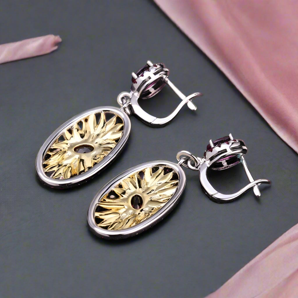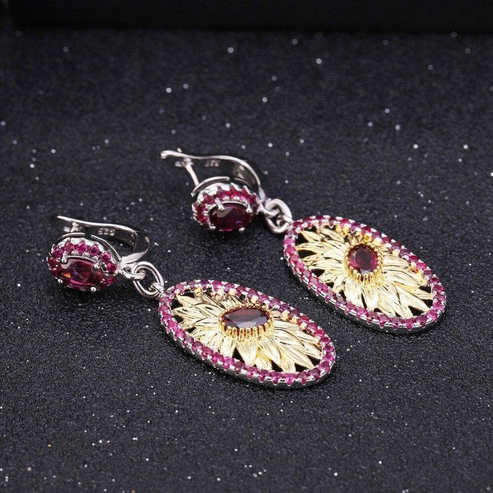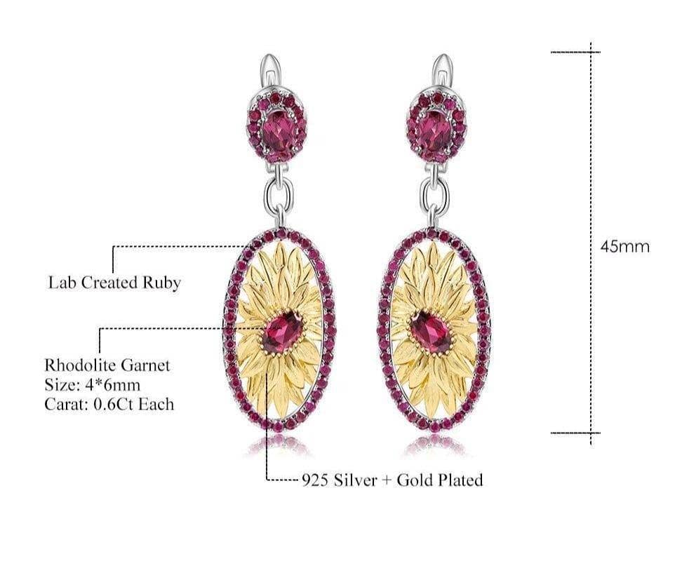 These elegant sunflower drop earrings feature 2.40 carats of natural rhodolite garnet as the centerpiece. Crafted from 925 sterling silver with gold plating, they also showcase lab-created ruby accents for added brilliance. Perfect for adding a touch of vibrant sophistication to any outfit.