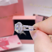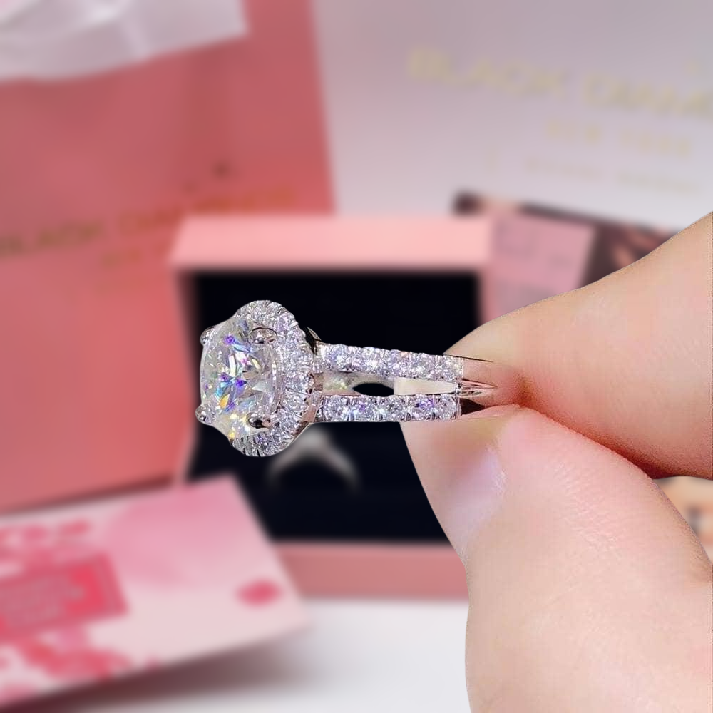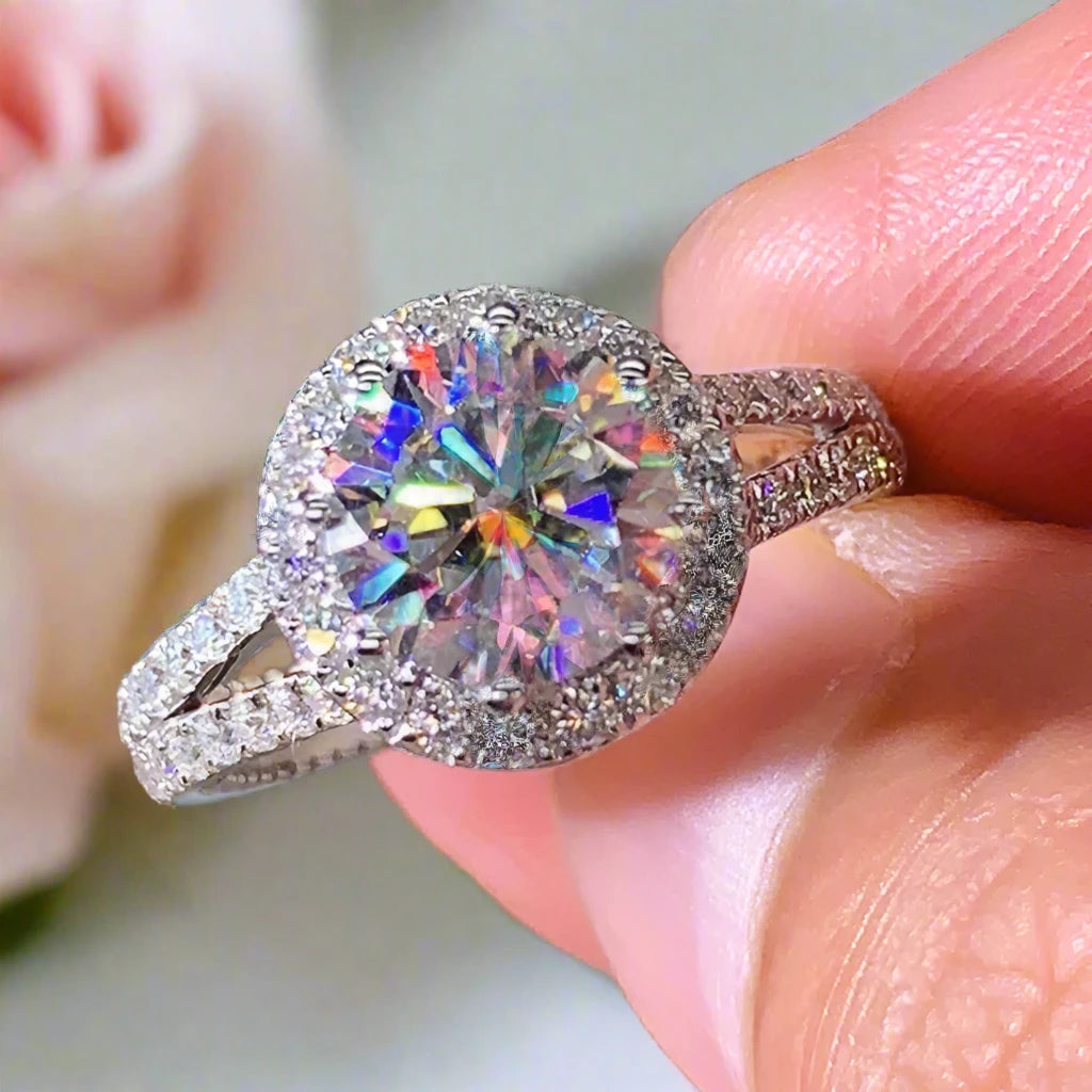 Fall in love all over again with our 2 Carat Round Cut Moissanite Split Shank Engagement Ring. Its breathtaking design, complete with a halo of smaller stones, exudes a stunning beauty that is simply unmatched. Crafted with high quality materials at an affordable price, this ring is the perfect choice for a sparkly and memorable proposal.
