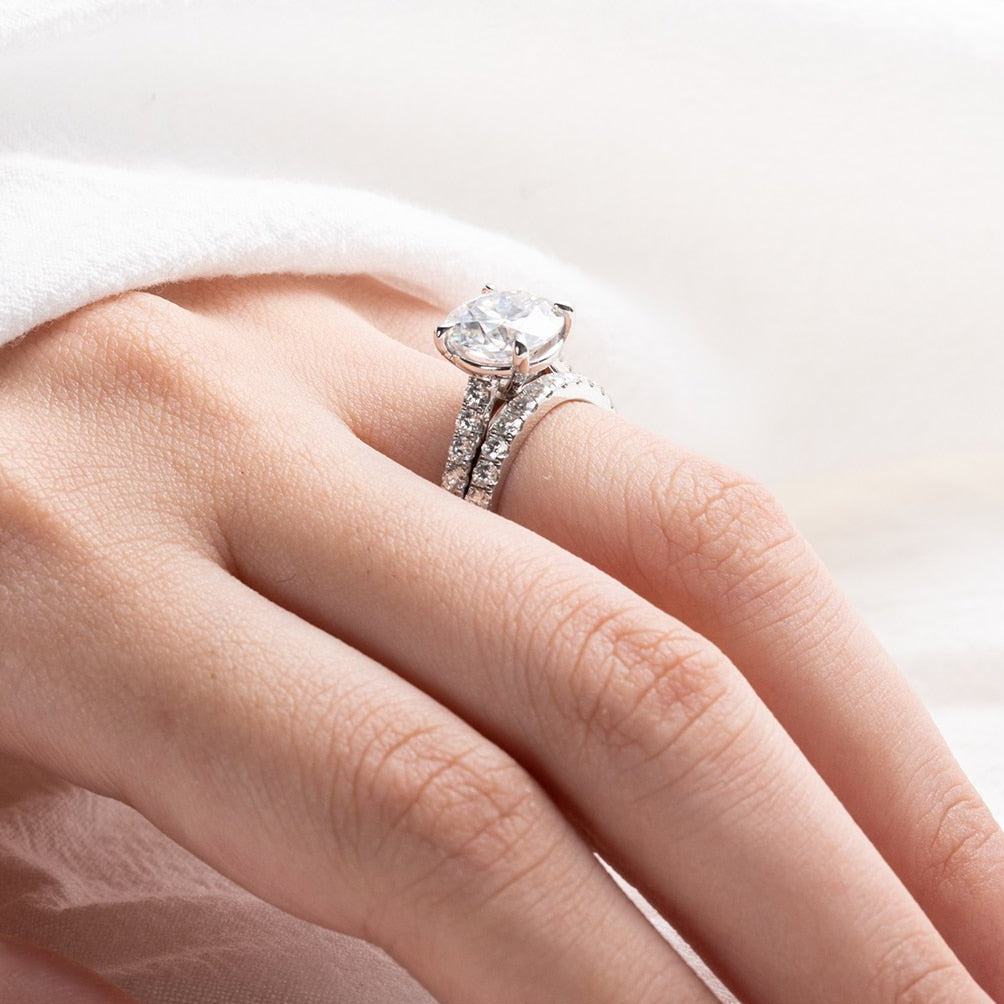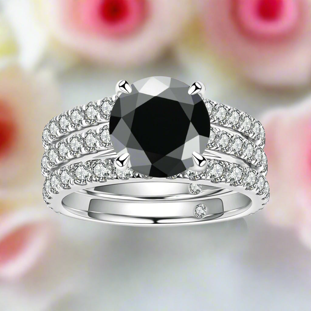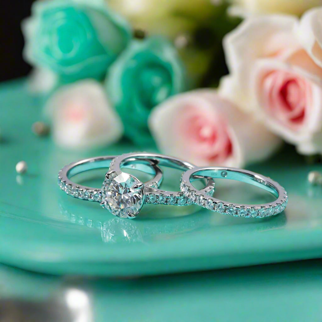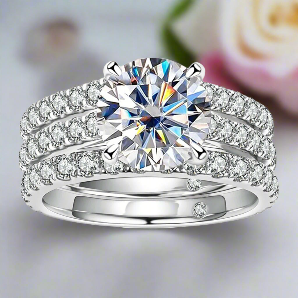 This classic 3-piece Certified Moissanite Ring Set features round-cut stones with elegant prong settings for maximum sparkle. The timeless design ensures these rings will remain beautiful for years to come.
