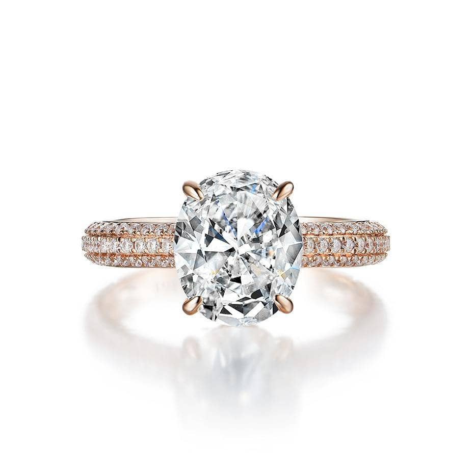 Enchanting and alluring, this 10k rose gold ring with its dazzling 5ct oval cut diamond is a sight to behold. Accented by an array of captivating and brilliant stones, this gorgeous piece of high quality jewelry is surprisingly affordable and is sure to make an incredible impact on all who set their eyes upon it.