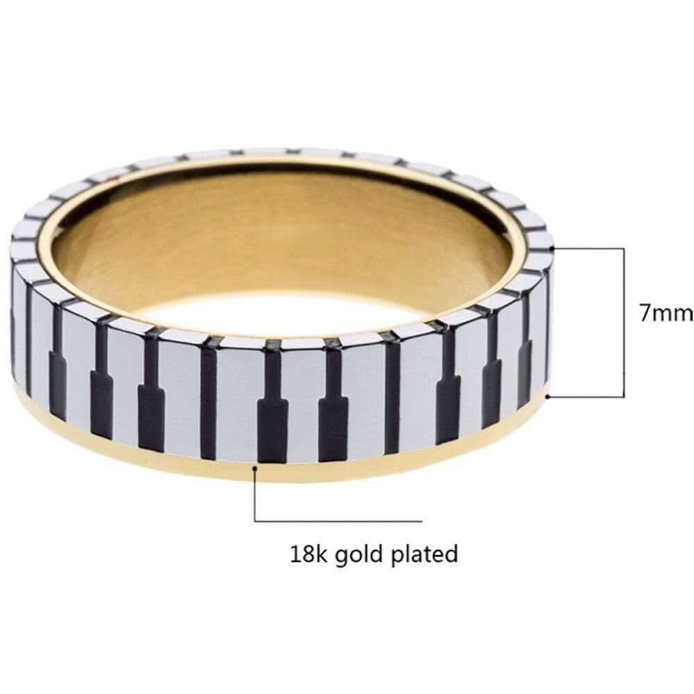 This Piano Wedding Band is expertly handcrafted to endure a lifetime of wear. Made from high-quality, ethically sourced materials, it features a sleek stainless steel finish and a smooth 7mm surface width.