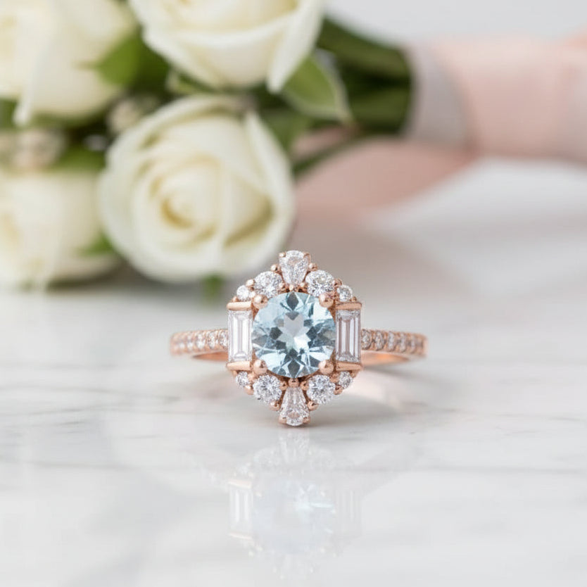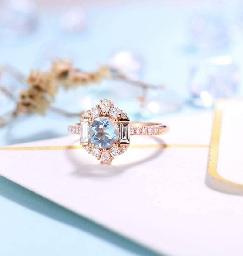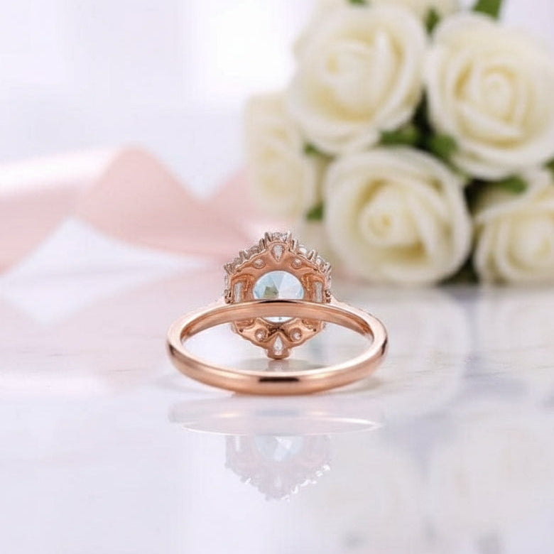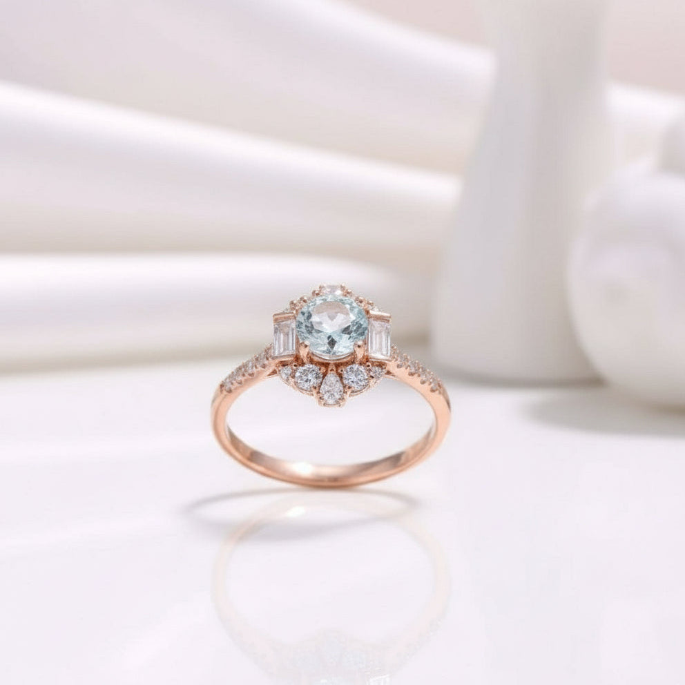 Treat your partner to the ring of their dreams with this magnificent rose gold engagement ring. Crafted from 14k rose gold, this exquisite piece features an eye-catching round aquamarine diamond, set in a halo design and surrounded by gorgeous sparkles. Enjoy the highest quality craftsmanship and materials at an affordable price - make your proposal memorable with this gorgeous engagement ring!