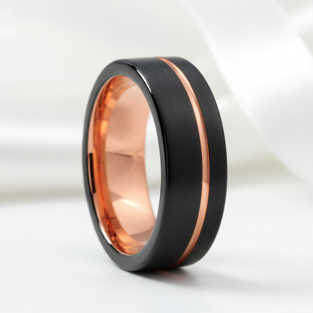 Experience the perfect blend of style and durability with this 6mm tungsten wedding band. Featuring a striking black brushed surface and elegant rose gold pipe cut detailing, it’s expertly handcrafted to endure a lifetime of wear and cherished moments.