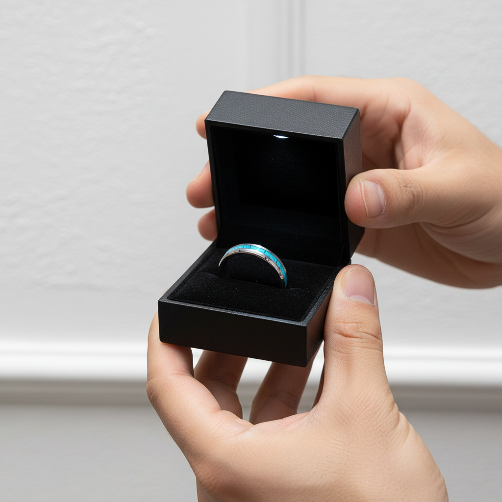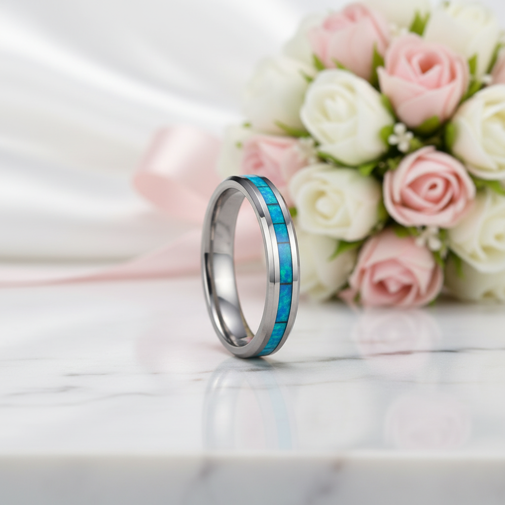 Crafted from responsibly sourced tungsten, this men's wedding band combines durability with distinctive blue opal styling. Built to withstand a lifetime of wear while breaking free from conventional, expensive designs. A modern choice for grooms seeking something beyond the traditional.