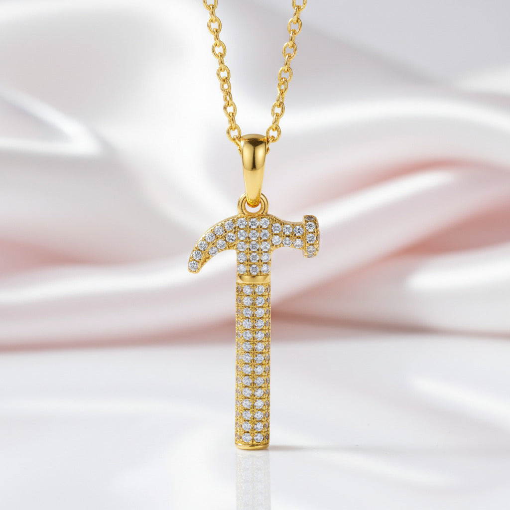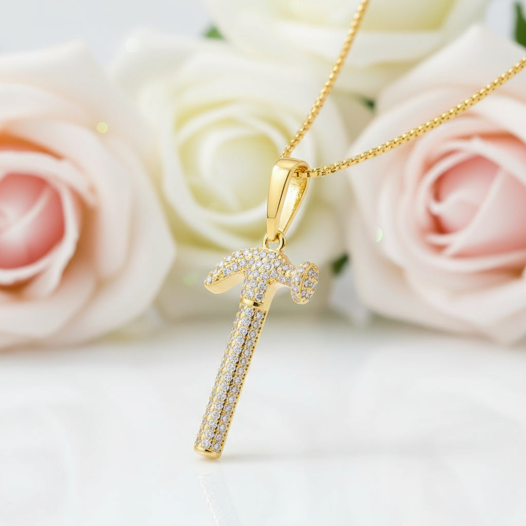Add a touch of glamour to your outfit with our Certified Moissanite Hammer Pendant Necklace by Black Diamonds New York. This eye-catching piece features a round cut moissanites in a striking hammer pendant design, perfect for those who appreciate unique jewelry. Made from 925 silver dipped 5 times in 18k yellow gold, this necklace combines style and quality without breaking the bank.