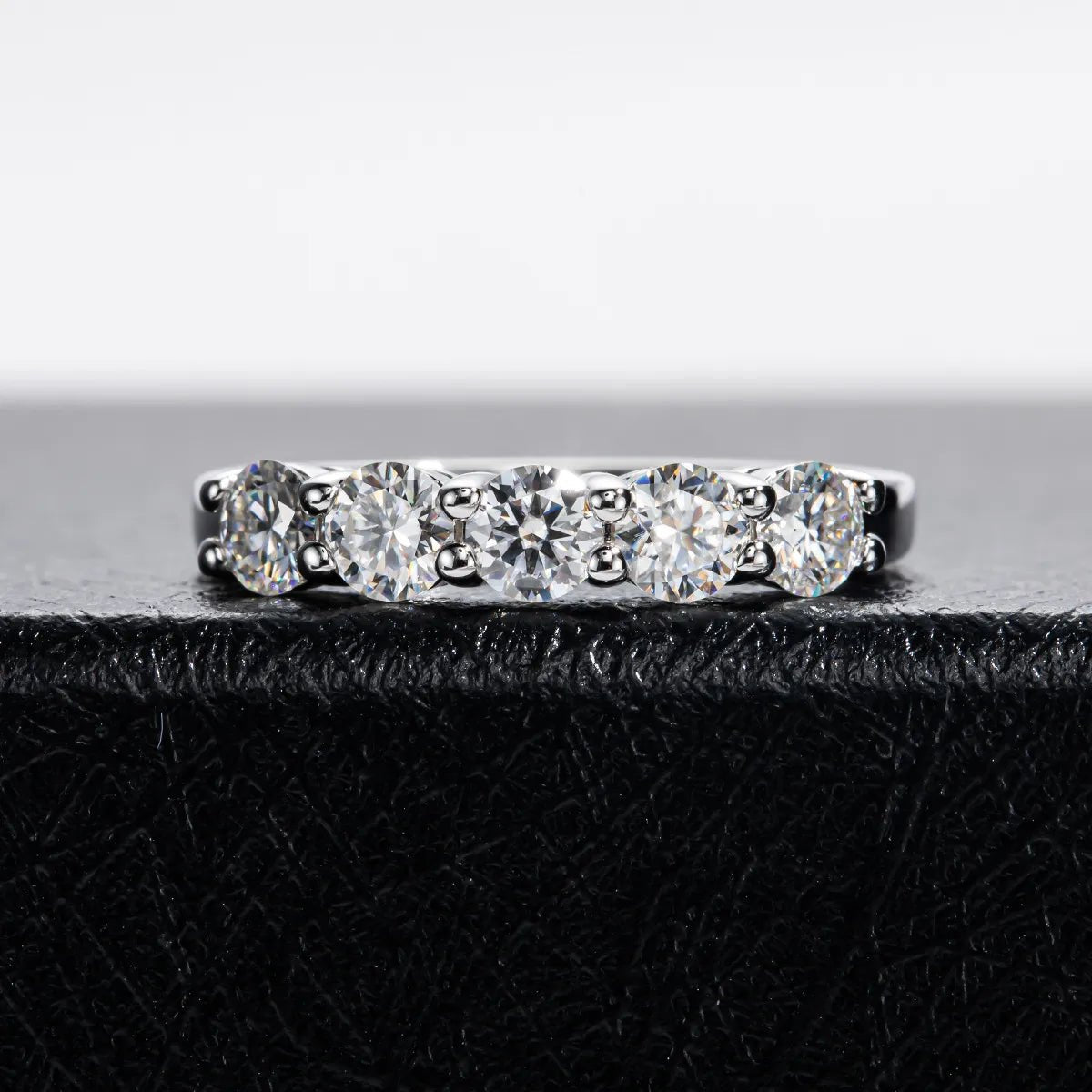 Enhance your collection of jewelry with the exquisite Five Stone 4mm Round Cut Diamond Wedding Band. Meticulously crafted, this stunning piece showcases a row of dazzling moissanite stones delicately placed in a prong setting. The mesmerizing brilliance of these stones is bound to captivate anyone's gaze. With its elegant design, this ring seamlessly adds a touch of sophistication to any ensemble. Indulge yourself or surprise your special someone with this timeless beauty.