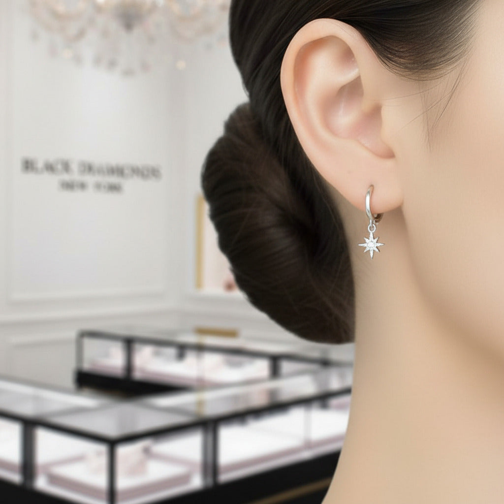 Discover the artistry of the Geometric Star Diamond Alternative Hoop Earrings from Black Diamonds New York. Combining 92.5% silver and 7.5% high-quality, hypoallergenic metals, these earrings strike the perfect balance between durability and comfort. The star motif is distinct and alluring, adding further glamour with its diamond inlays. Featuring an exceptional value, these earrings are ideal for trendsetters seeking to make a bold statement without sacrificing their budget.