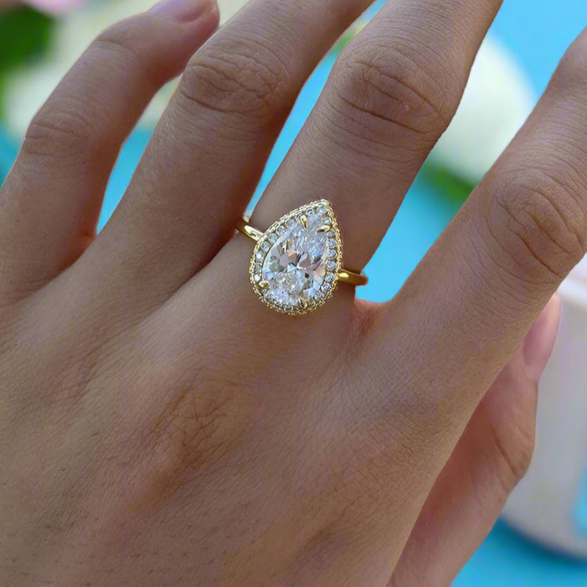 Halo Pear Cut Solitaire Yellow Gold Engagement Ring