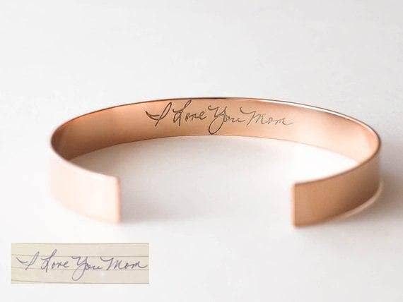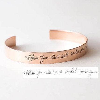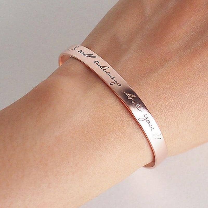 Crafted with beautiful handwriting inscriptions, this cuff bracelet is made from durable stainless steel and comes in three stunning plating options: silver, gold, and rose gold.