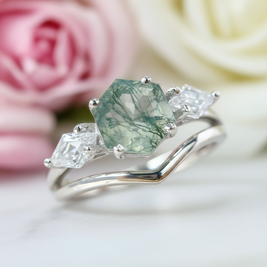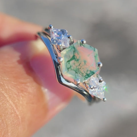 Hexagon Natural Moss Agate Engagement Ring Set features a custom-cut natural moss agate stone with two elegant kite-shaped side stones. Hand-selected for unique coloring and ethically sourced, this lightweight design combines natural beauty with lasting durability perfect for marking life's most meaningful moments.