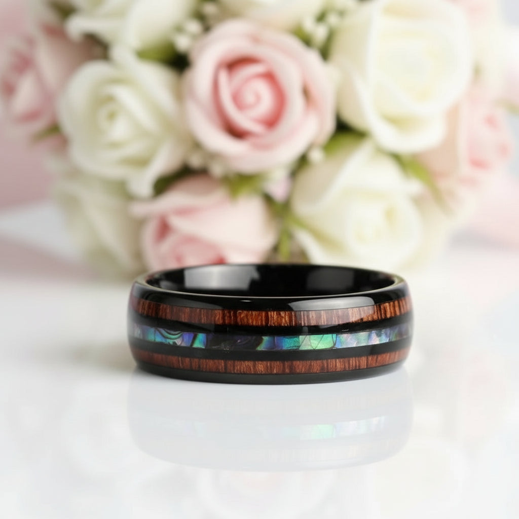 Experience the unmatched durability and style of our Tungsten Carbide Men's Ring, featuring a 6mm/8mm surface width and stunning inlays of Koa Wood and Abalone Shell. The perfect combination of natural beauty and strength in one ring!