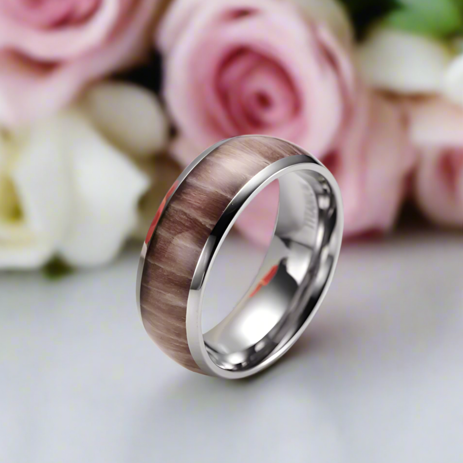 Crafted from premium, ethically sourced materials, this men's 8mm titanium wedding band with wood inlay offers lasting durability and unique style. Ditch the dull and overpriced rings choose a band that stands out and endures a lifetime.