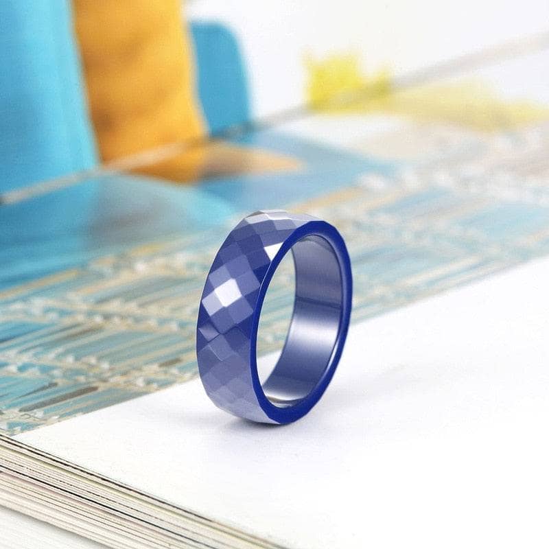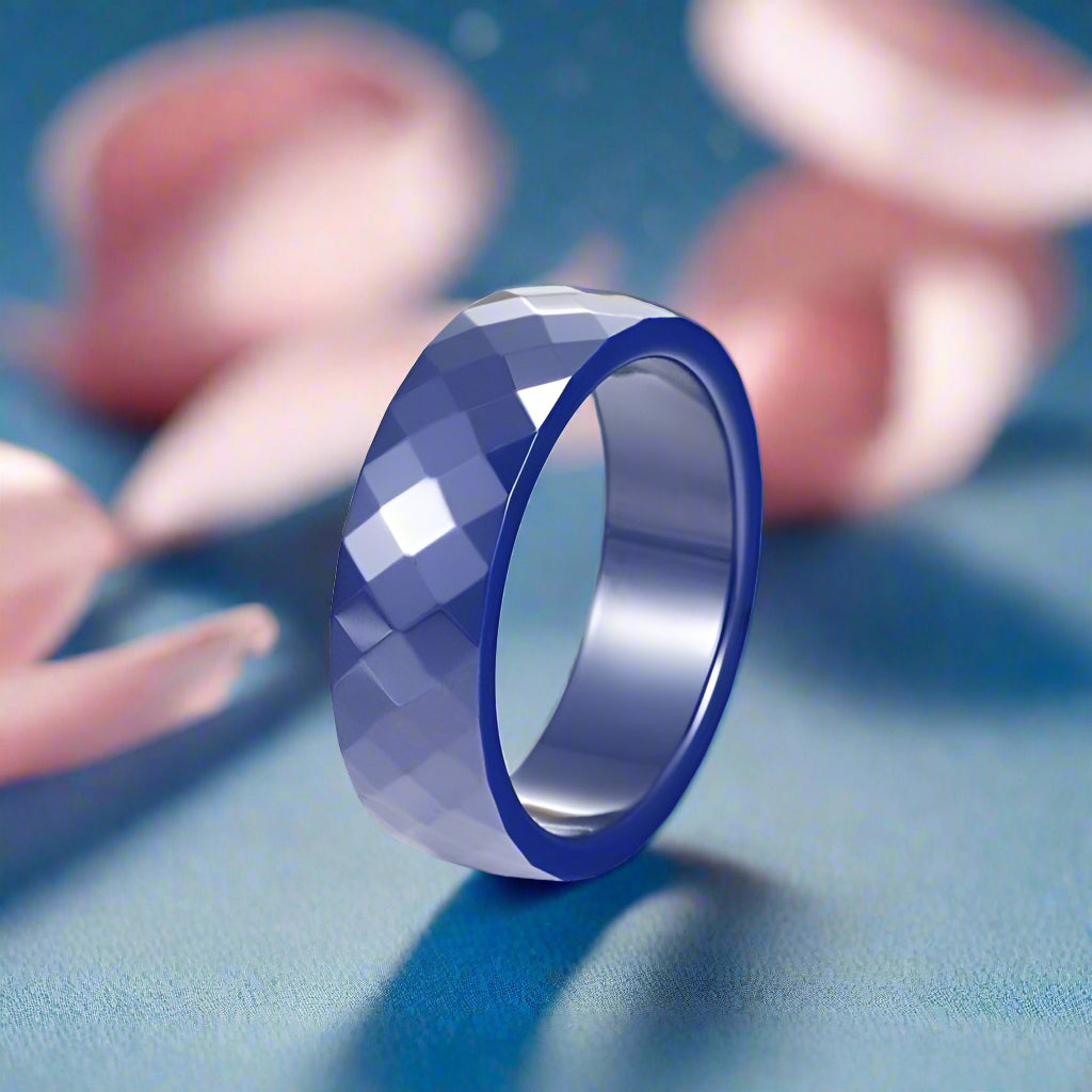 This multi-faceted blue ceramic wedding band is crafted from exquisite, ethically sourced materials designed for enduring elegance. Elevate your commitment with a distinctive alternative to conventional, costly rings.
