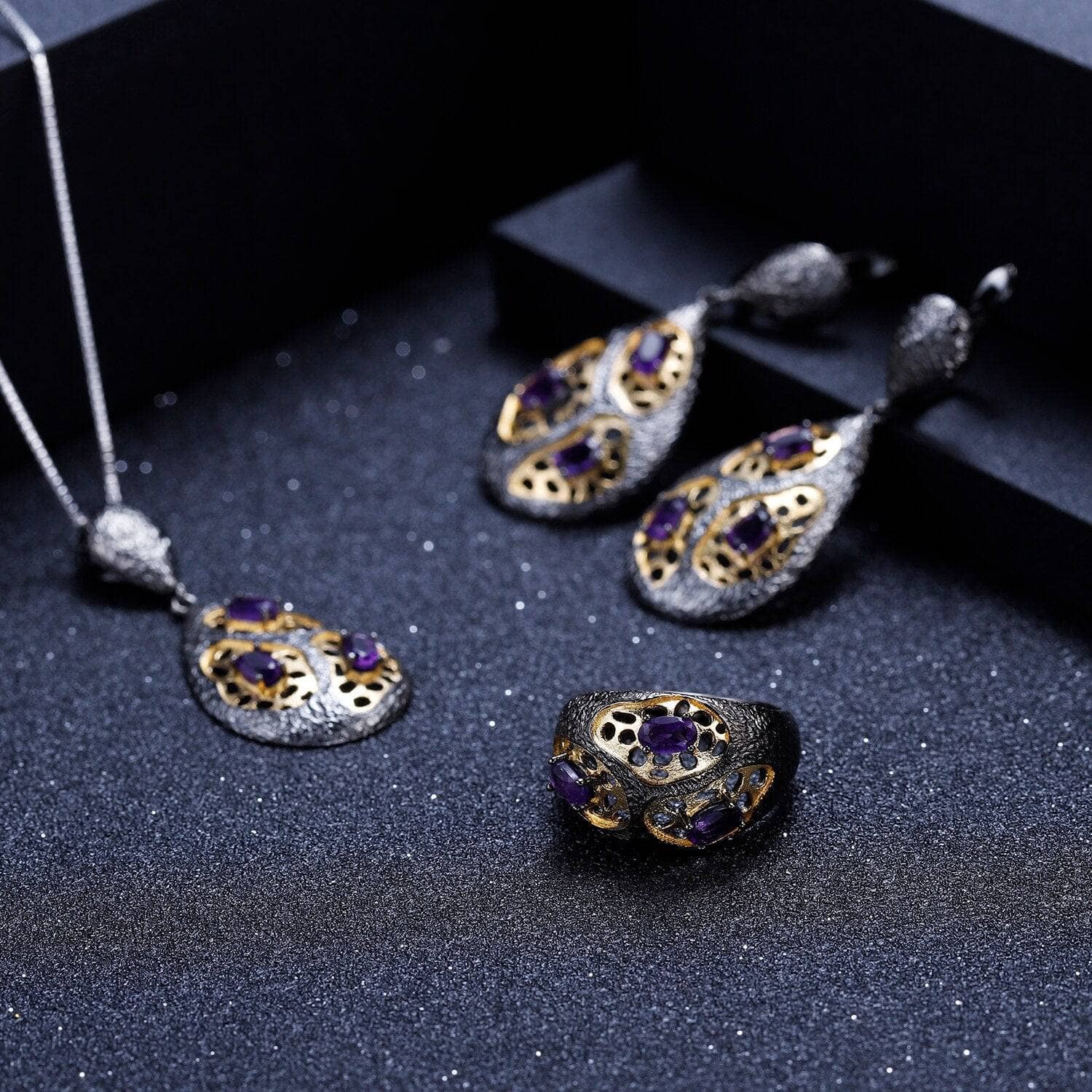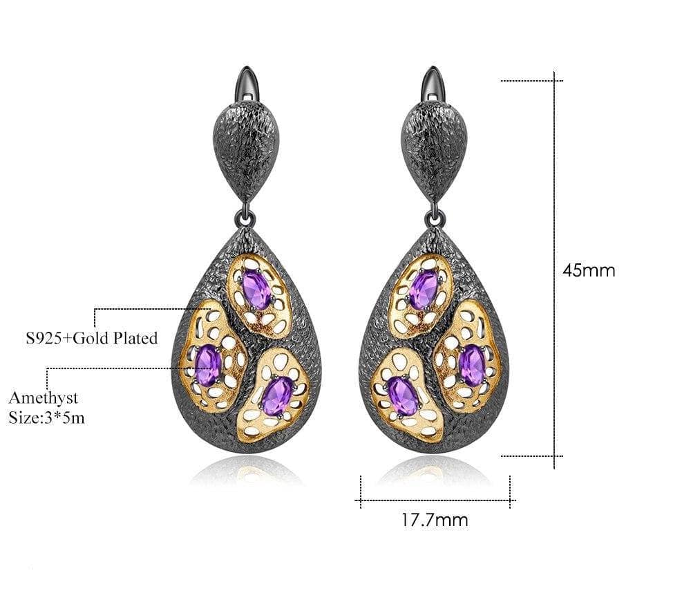 Elevate your style with these exquisite drop earrings featuring genuine amethyst stones measuring 3mmx5mm. Crafted by hand from 925 sterling silver and finished with a luxurious gold plating, these earrings combine natural beauty with timeless elegance. Perfect for adding a touch of sophistication to any outfit.