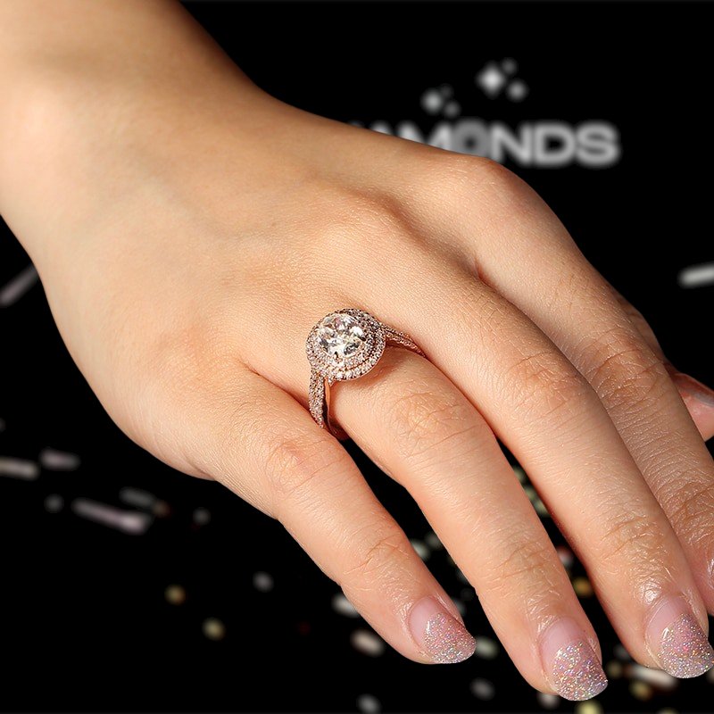 Get ready to be the focal point of all admirers with this magnificent Oval Cut 14k Rose Gold Double Halo Engagement Ring. Sporting the undeniable allure of moissanite - a gemstone known for its brilliant sparkle, this ring promises to catch every eye. Crafted in spectacular 14k rose gold, its luxurious construction offers an appeal that is both antique and modern. The ring's oval cut nicely complements its double halo setting, serving as a testament to your love and commitment. Emanating elegance with every wear, this ring makes for a perfect proposal piece, an ideal symbol of your undying love.