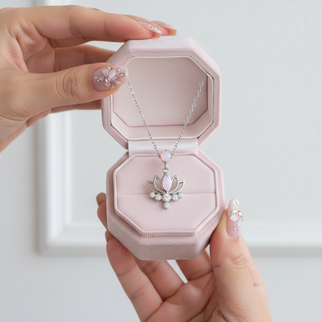Pink Opal Lotus Flower Pendant Necklace featuring a stunning pink stone centerpiece set in 925 silver with white gold plating. The lotus flower symbolizes purity and enlightenment, making this piece both beautiful and meaningful. Crafted for durability and designed to turn heads, it's the perfect blend of luxury and affordability.