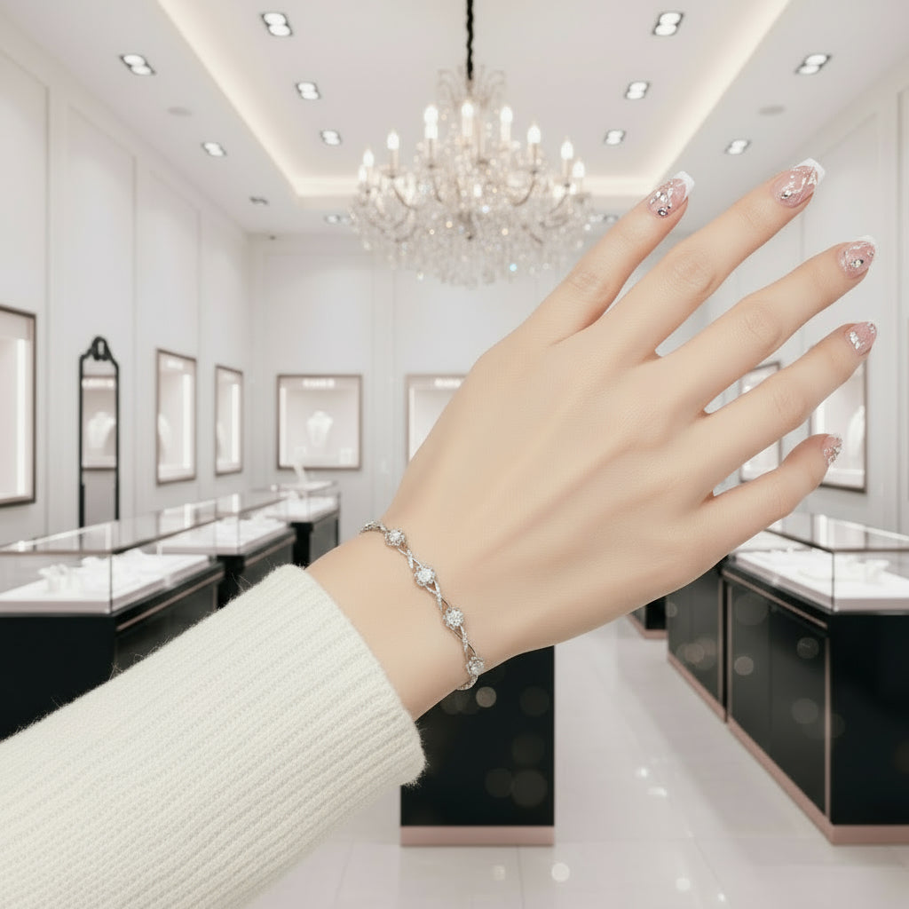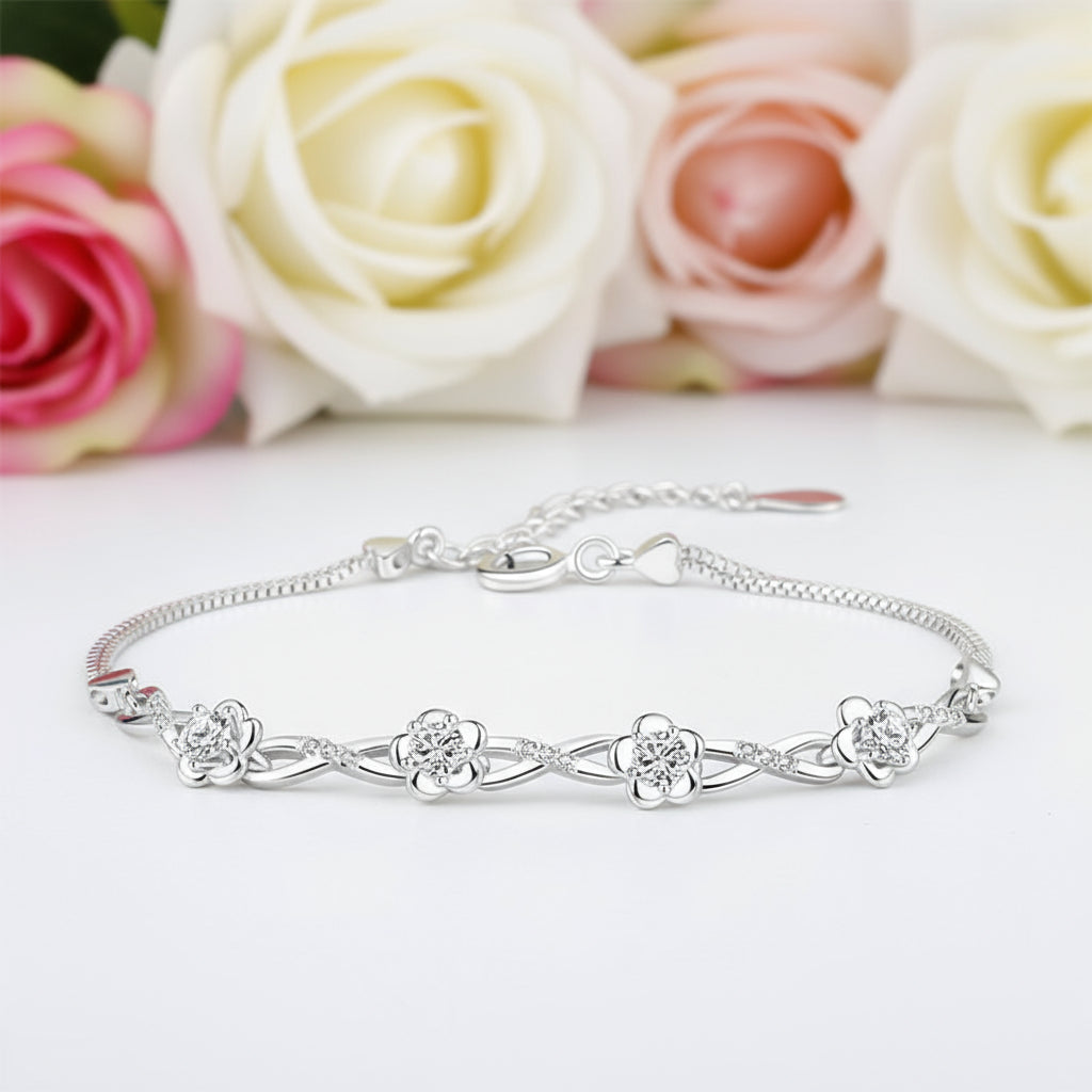 Create a lasting impression with our exquisite Platinum & Silver Flower Sweet Bracelet. Crafted with high-quality materials, this piece features stunning silver plating with a luxurious white gold finish, adorned with sparkling created diamonds for a touch of elegance and sophistication.