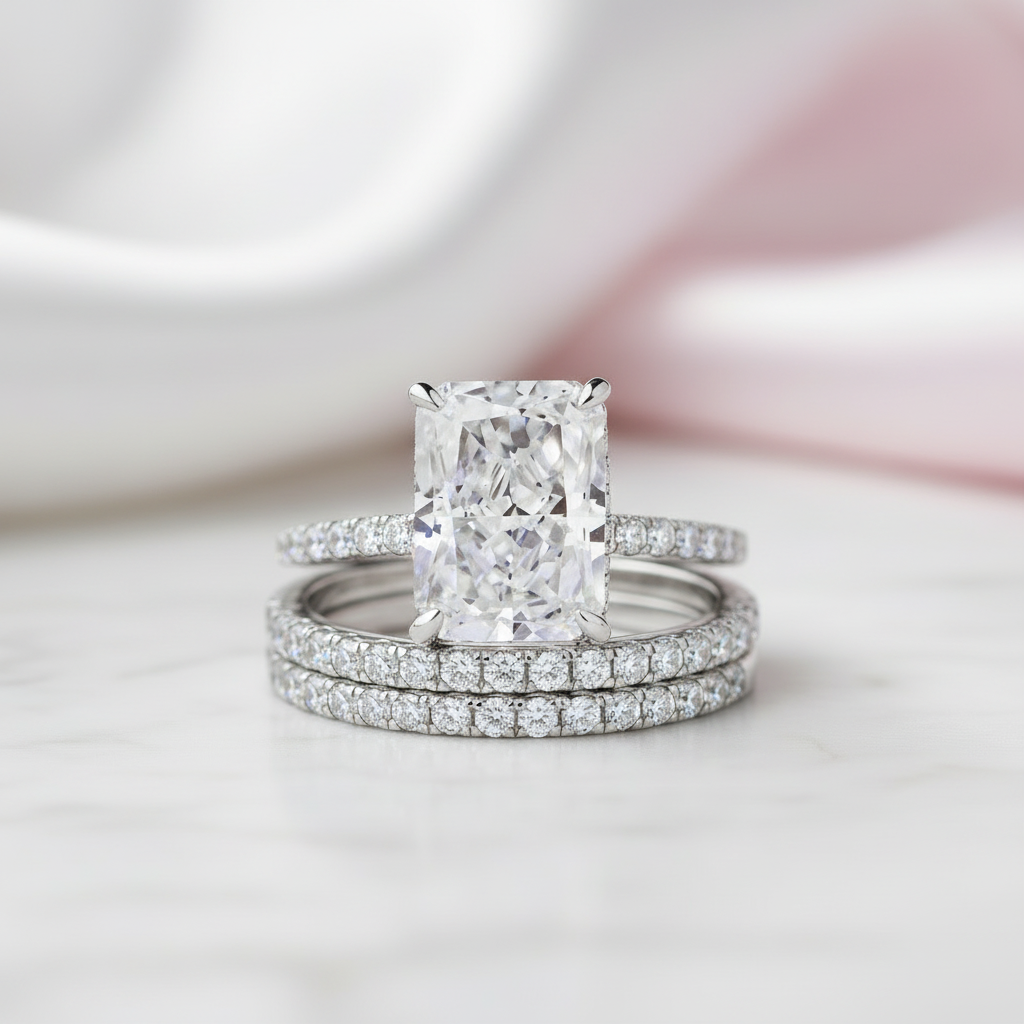 Experience the luxurious brilliance of Radiant Cut Diamond 3pcs Ring Set. The focal point, a dazzling 3.5 carat Simulated Diamond, is expertly cut into a radiant shape for maximum sparkle. This set also features sparkling round cut stones on the band, all set in high-quality sterling silver with a brilliant white plating. Elevate your style and add a touch of elegance with this stunning ring set.