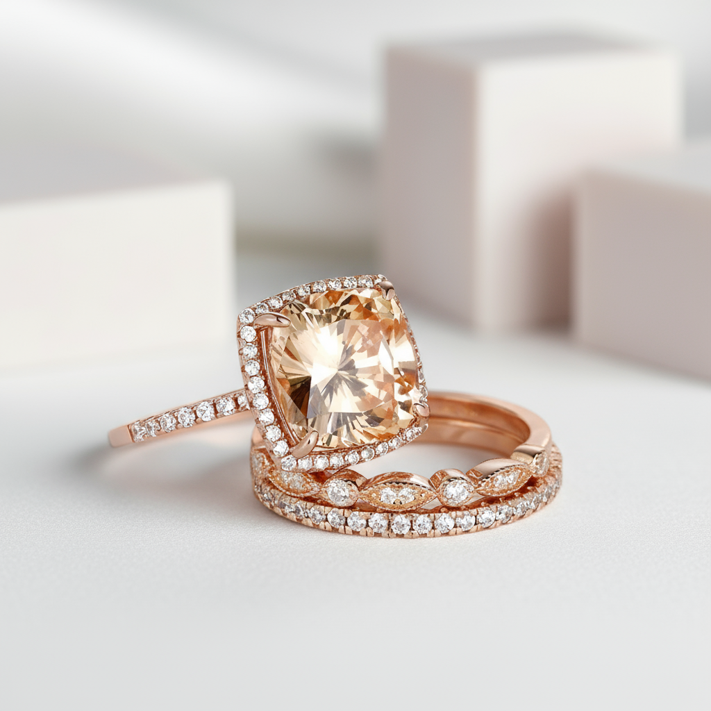 A stunning three-piece ring set featuring cushion-cut champagne stones in rose gold. Handcrafted with exquisite detail, this versatile set works beautifully as an engagement ring, wedding band, or anniversary gift. Perfect for any special occasion.