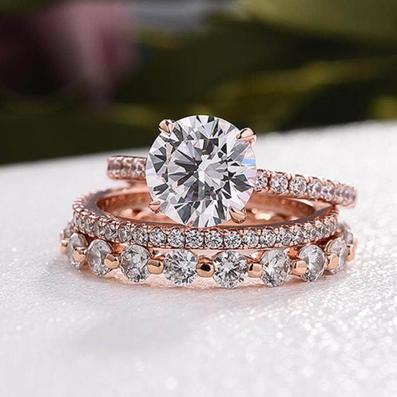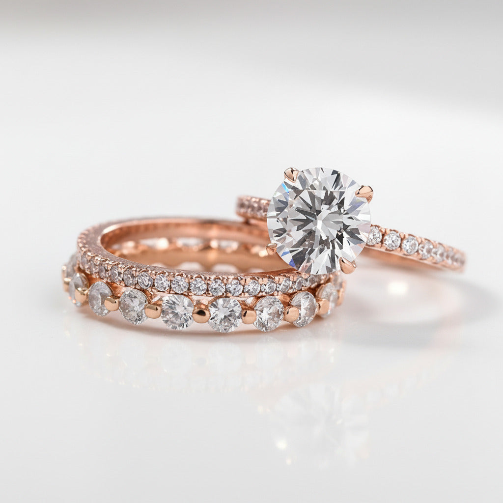 A timeless pairing designed for the modern bride and groom. This rose gold wedding set features a classic round cut diamond that captures light with elegant simplicity. The coordinating band complements the center stone perfectly, creating a cohesive look that works beautifully on its own or stacked with other rings. Crafted to last a lifetime, this set combines traditional romance with contemporary sophistication.