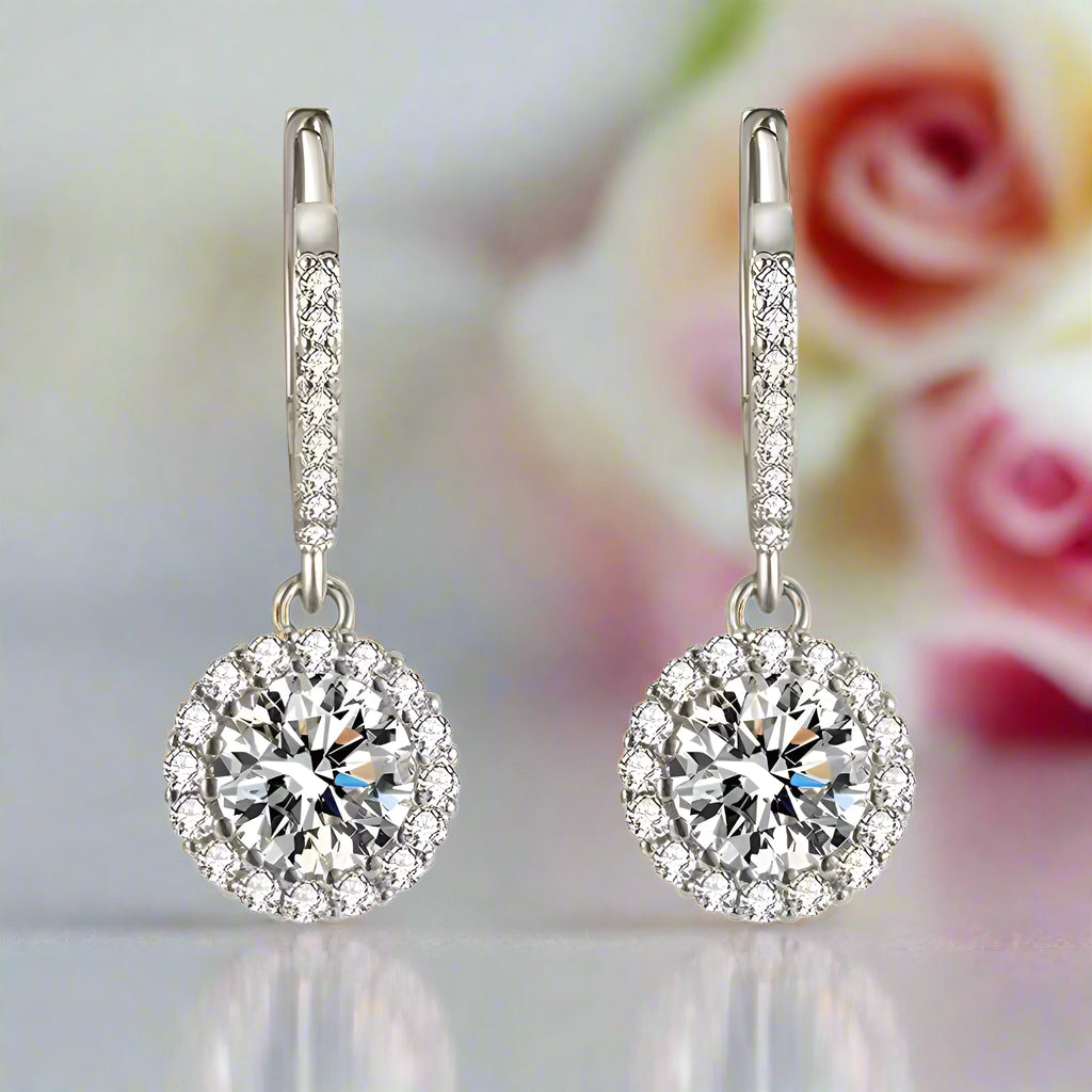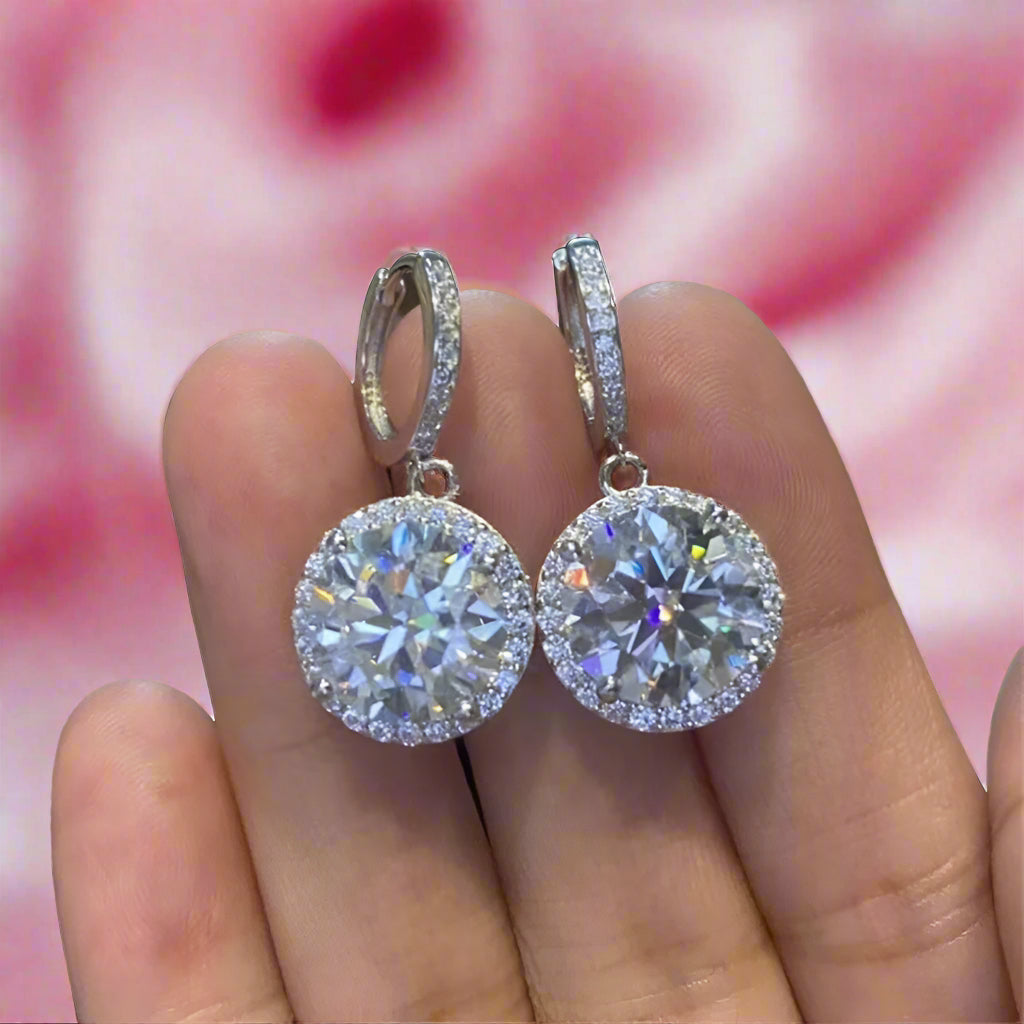 Make a glamorous entrance with these Round Cut Certified Moissanite Earrings by Black Diamonds New York. With a total of 10 carats of sparkling diamonds, these stunning earrings are sure to add a touch of elegance to any outfit. The round cut diamonds are complemented by a halo of smaller stones, creating a captivating and visually appealing look. Made with high-quality materials, these earrings offer a level of sophistication that is both affordable and chic.