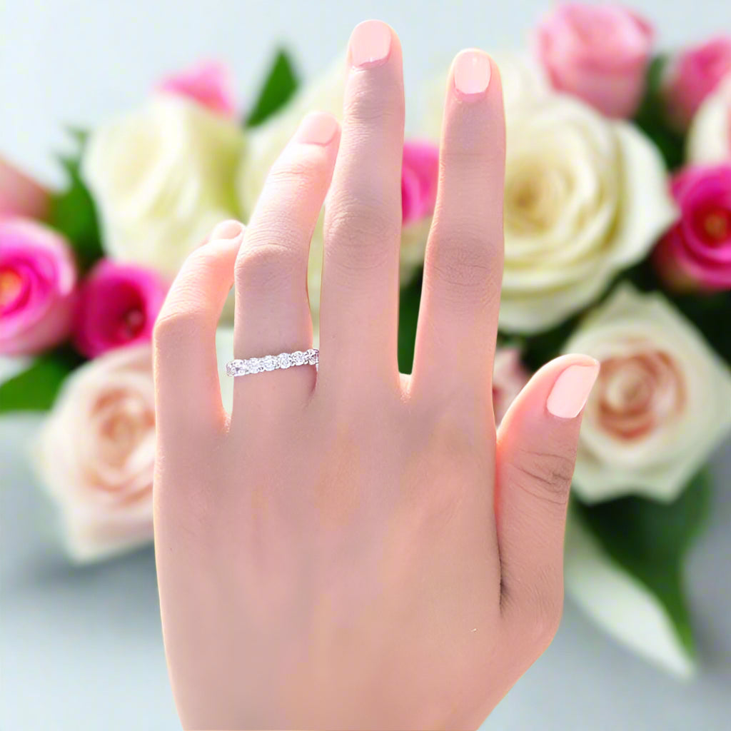 Elevate your wedding with our Round Cut Eternity Wedding Band. Crafted from 925 Sterling Silver, this band features a stunning Diamond Alternative that sparkles in a classic Round Cut shape and measures 0.3 cm x 0.3 cm. The Clear White color and 3mm band width add a touch of sophistication, while the high polish finish gives it a luxurious shine. Elevate your style and make a statement with this exquisite wedding band.