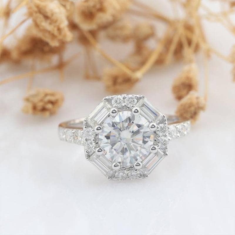 Surprise your special someone with a memorable gift they'll treasure. This 14k White Gold Engagement Ring provides an elegant look with its round cut 1.5 ct diamond, framed by a luxurious halo design. This ring is as stunning as it is affordable, ensuring a perfect tribute to your feelings. need to break the bank!