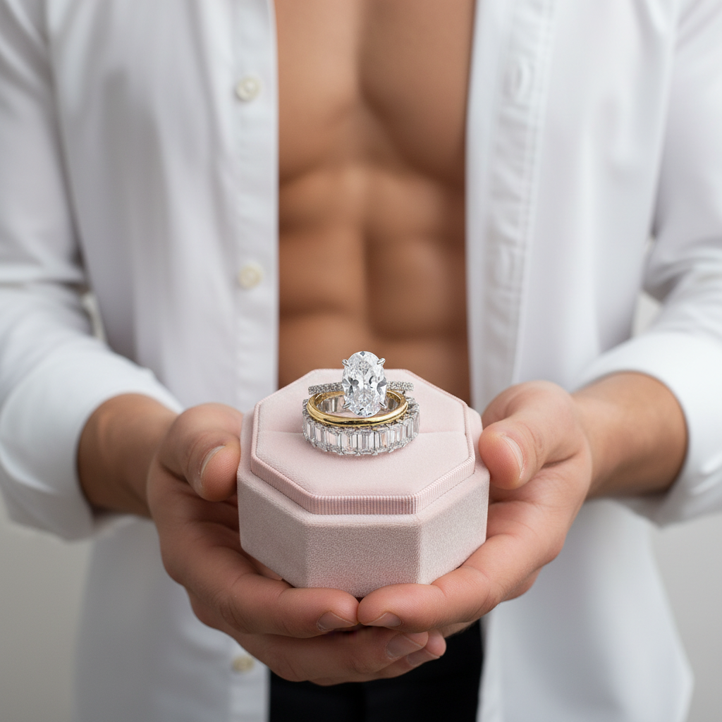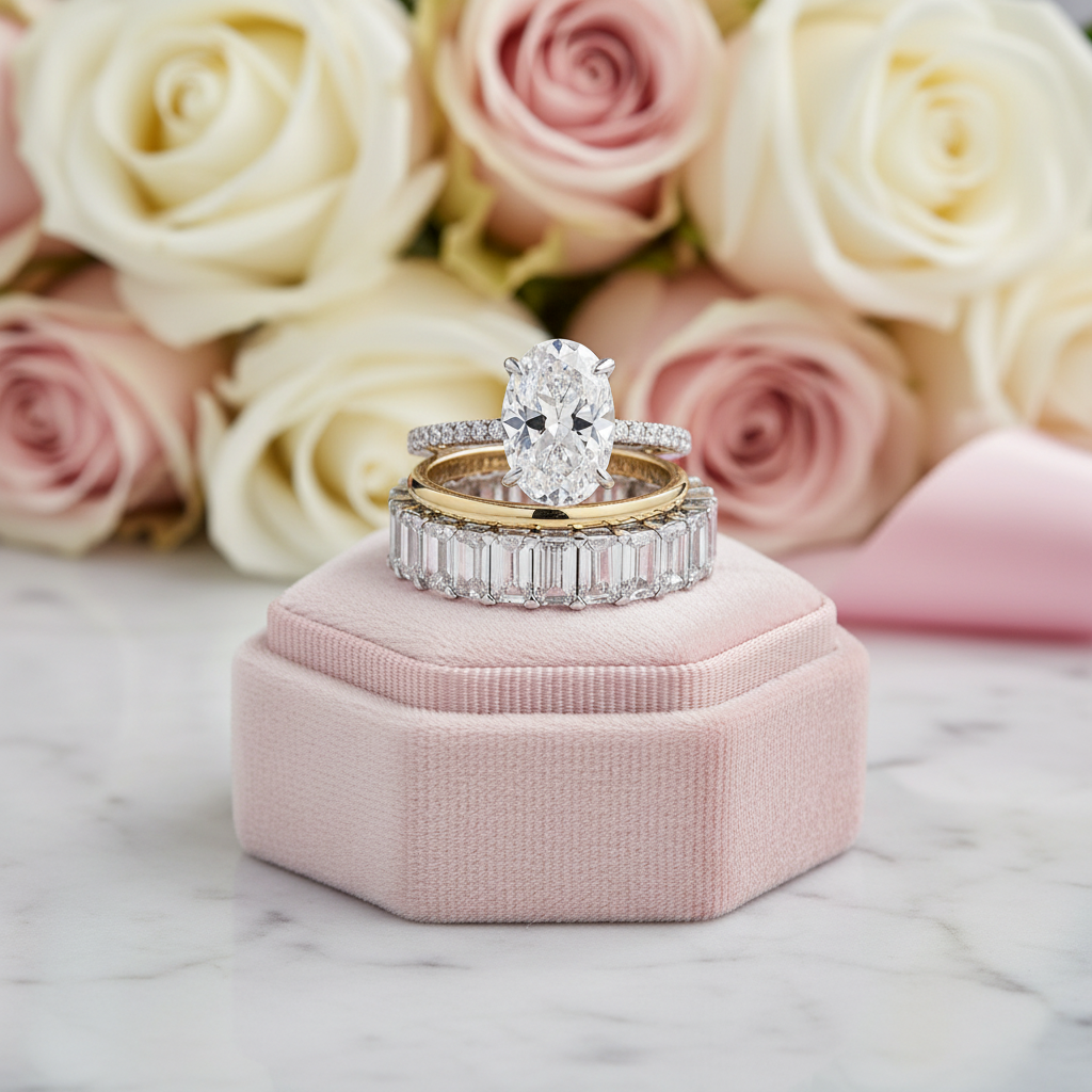 A three-piece bridal set with a stunning 3.5-carat oval-cut diamond. Designed to work beautifully together, this collection delivers elegance and sparkle for your wedding day.