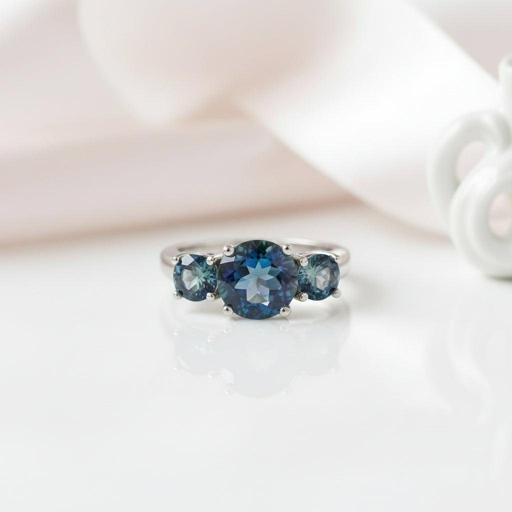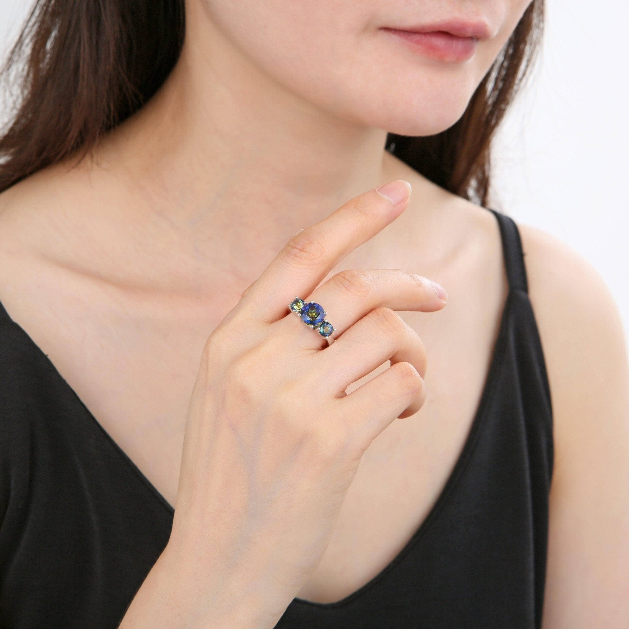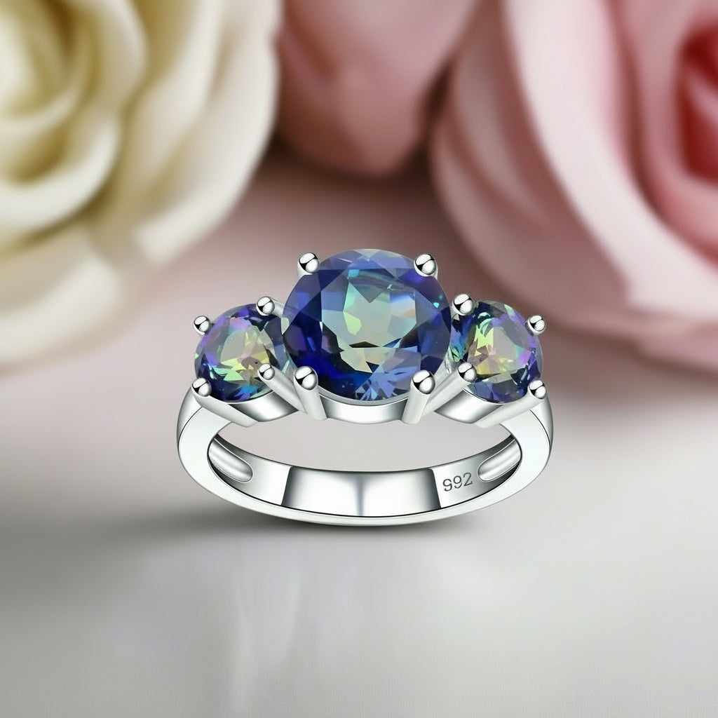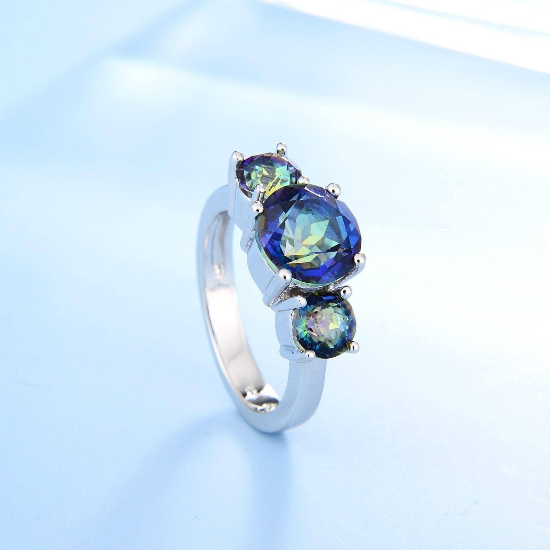 Captivating Three Natural Mystic Topaz Birthstone Ring featuring a stunning 8mm round main Mystic Topaz gemstone, elegantly complemented by two 5mm round Mystic Topaz side stones. The premium prong setting securely showcases these mesmerizing gems, creating a dazzling effect that will draw compliments wherever you go. This exquisite piece transforms any outfit from ordinary to extraordinary.